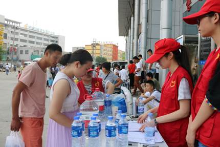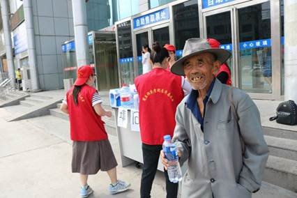 刚到汽车站,看到有许多的环卫工人正在辛苦的工作,志愿者们纷纷上前递上水和纸巾,并把他们扶到阴影处,替他们分担一些烈日。摆出咨询台没一会儿,就被围的水泄不通,有问路的外地乘客,有询问班次的一家三口,还有很多初次网上购票的乘客,志愿者们都详细且耐心的一一解答。