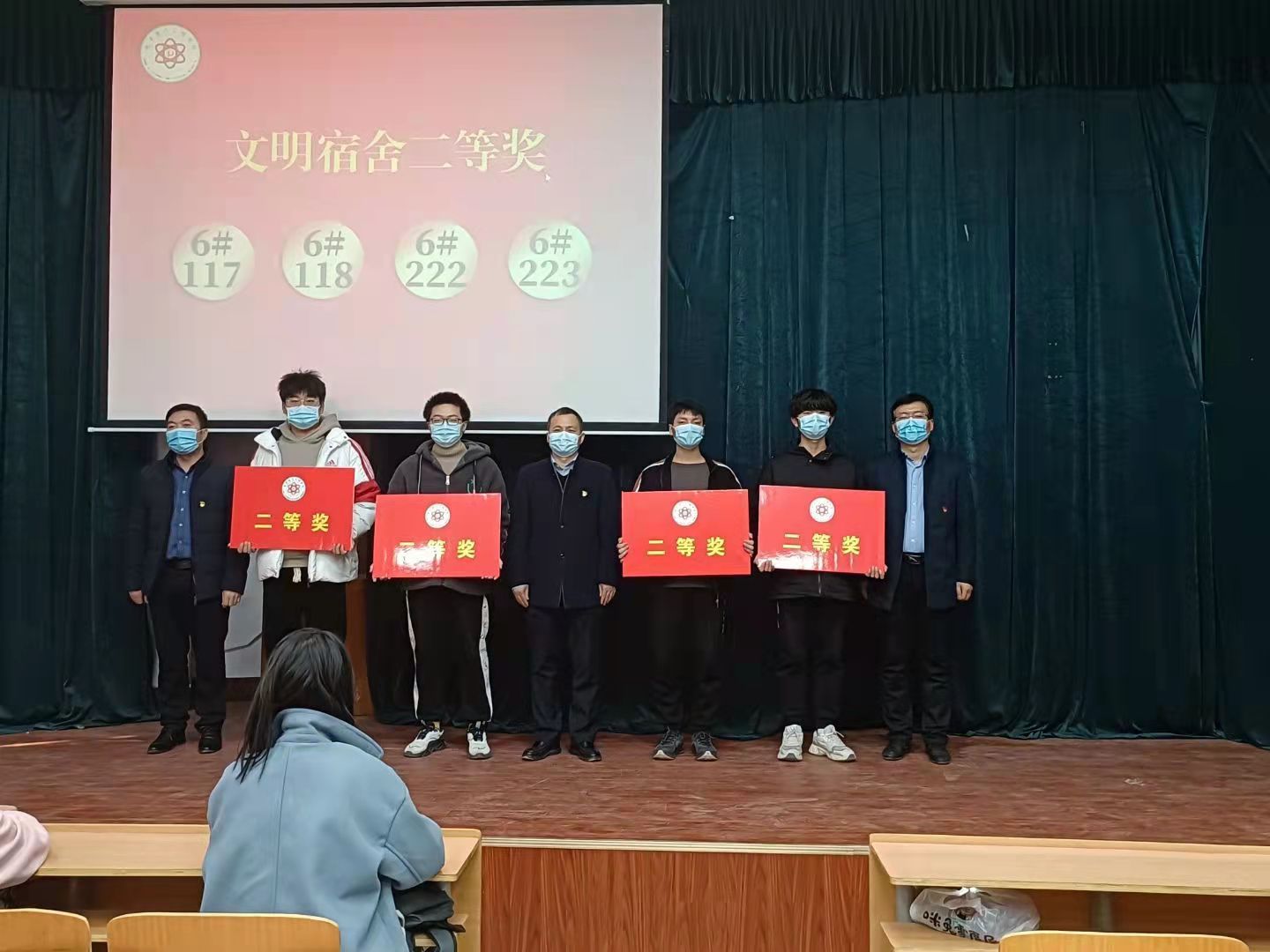 蒋玉涛代表学院对受表彰的宿舍表示祝贺。他指出宿舍是大学生生活、学习、娱乐为一体的归属地,是和谐校园建设的基础,是校园文明建设的重要组成部分。对此,他提出了四点希望和要求:一、要建立科学规范严格的宿舍管理制度,坚持定期检查宿舍内务公示制度。二、要增强安全防范意识,提高自我防范能力,确保身心健康。三、要加强宿舍文化建设,构建和谐稳定的人际关系。四、要注重宿舍环境卫生,养成良好的卫生习惯,营造舒适整洁的宿舍卫生环境。