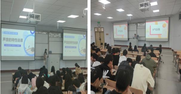 在第二环节,工作坊各组代表通过ppt讲解、视频演示、现场实验等方式进行学习成果展示,同学围绕说教材、说教学目标、说学情、说教学过程、说板书设计几大板块展开说课。