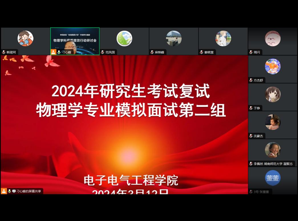 2024年研究生招生考试初始成绩国家线已经发布,为促进物理学专业考研学生更好熟悉和应对复试环节,3月12日,物理系举行研究生复试线上模拟面试活动,具备面试资格的近30名学生参加。物理系13名任课教师参与指导。