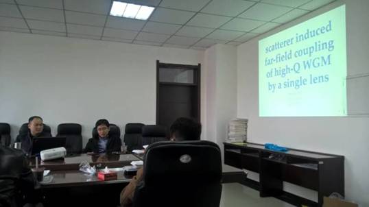 舒方杰博士做了题为“Chiral symmetry breaking in a microring optical cavity by engineered dissipation”的学术报告,大家边吃边听,时而就报告内容提出一些问题。 方杰博士还谈及国外留学期间的工作经历和收获,激发了部分博士申请国家留学基金委河南省地方合作项目的热情。 研讨会期间,大家畅所欲言,就开展科研合作和当前研究的热点问题谈了个人看法,整个讨论会在轻松愉快的氛围中进行。