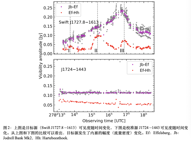 研究人员通过巧妙分析源的可见度数据,获得了源的流量密度和结构变化的信息:在6个小时的观测过程中,目标源经历了大幅的射电光变(图2上图中的紫色、灰色数据点);Hartebeesthoek基线的可见度幅度(图2上图中的红色数据点)显示了规则的震荡,说明伴随着光变,目标源发生了相对论性等离子团块的抛射,团块运动的视速度达到0.6倍的光速。据此,研究人员对喷出等离子题团块的多普勒因子,动能,团块膨胀速度,以及团块内部磁场等参数做了估计。本次EVN观测发生在一个持续4天左右的大的射电闪耀活动期间,在6个小时的观测时间内看到团块抛射,说明在此期间类似的团块抛射应该相当频繁。