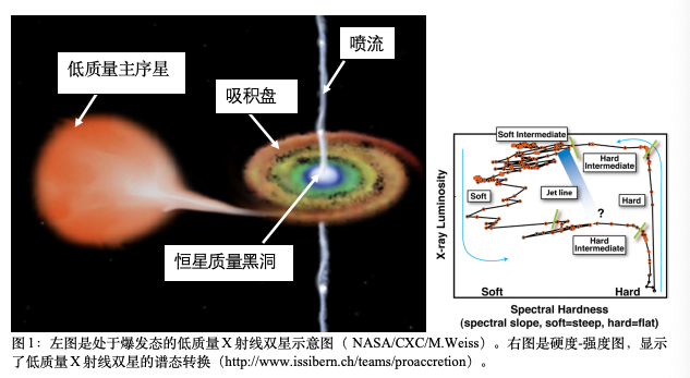 近日,天文学顶级期刊ApJL(Astrophysical Journal Letters,中科院1区top)发表了我校威廉williamhill曹洪敏博士在低质量黑洞X射线双星暂态喷流VLBI观测方面的最新进展。低质量X-ray双星是天空中的一类暂现源,其主星是一颗恒星质量黑洞或者中子星,其伴星是一颗质量小于一个太阳质量的主序星或者演化的恒星(见图1,左图)。黑洞低质量X射线双星(主星是黑洞)具有非常规则的谱态演化。这类源一生中大部分时间处于宁静态(quiescent state),偶尔进入爆发态。在爆发态期间,源的谱态通常会从低硬态(hard state),经由硬的中间态(hard intermediate state)和软的中间态(soft intermediate state),演化至高软态(soft state),再经由低光度的中间态回到宁静态(见图1,右图)。整个过程持续几个月或者数年。