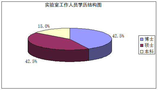 威廉williamhill非常重视实验室的管理工作,由陈文聪院长担任领导组组长,副院长李朋博士担任主管院长,麻焕锋博士担任主任,杜雪莲博士担任副主任。成立了实验室安全工作领导组,组长由院长陈文聪担任,工作组成员有陈文聪、李朋、麻焕锋、杜雪莲、刘红兵、陈青清。为强化实验室的管理,各个实验分室都有专人负责。实验教师和实验室管理人员共有66人,其中教授6人,副教授14人,讲师38人,初级职称成员8人,具有高级职称者占中心人员的33%;拥有博士学位者30人,硕士学位者28人,博士、硕士教师占实验室人员的85%。实验教师职称结构合理,学历状况理想,专业覆盖面宽,学缘结构广,年龄梯次优化。实验室工作人员职称和学历结构如下图。实验室还制订了完善的规章制度,如《实验室工作人员守则》、《仪器设备损坏赔偿制度》、《实验室开放管理规定》等20多项。