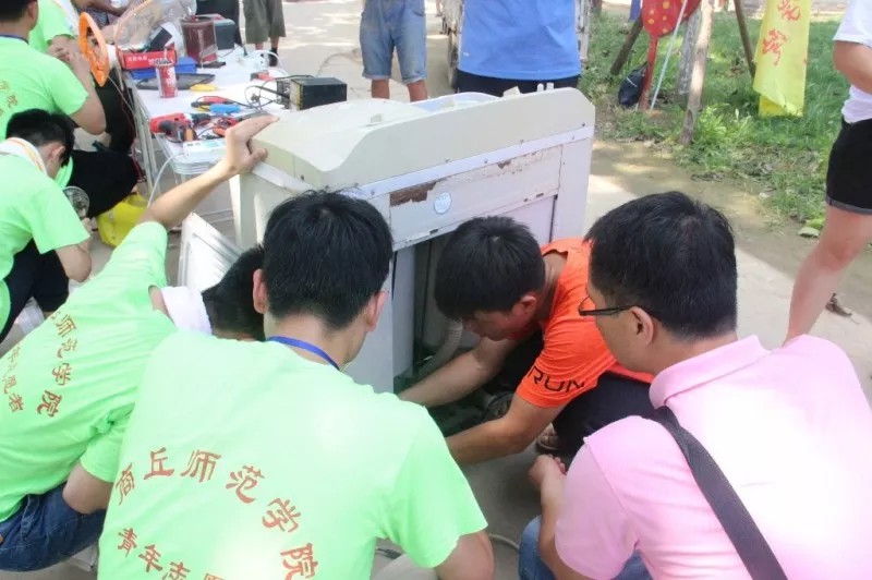 7月14日上午,维修队员们抵达目的地——民权县绿洲街道办事处吴庄村。家电义务维修服务团队由技术指导老师和家电义务维修社成员组成。维修开始就吸引了许多村民,有来询问问题的,有抱着孩子围观的。看到老师、队员们在很短的时间内就将家电修好了,大家纷纷表示了感谢。