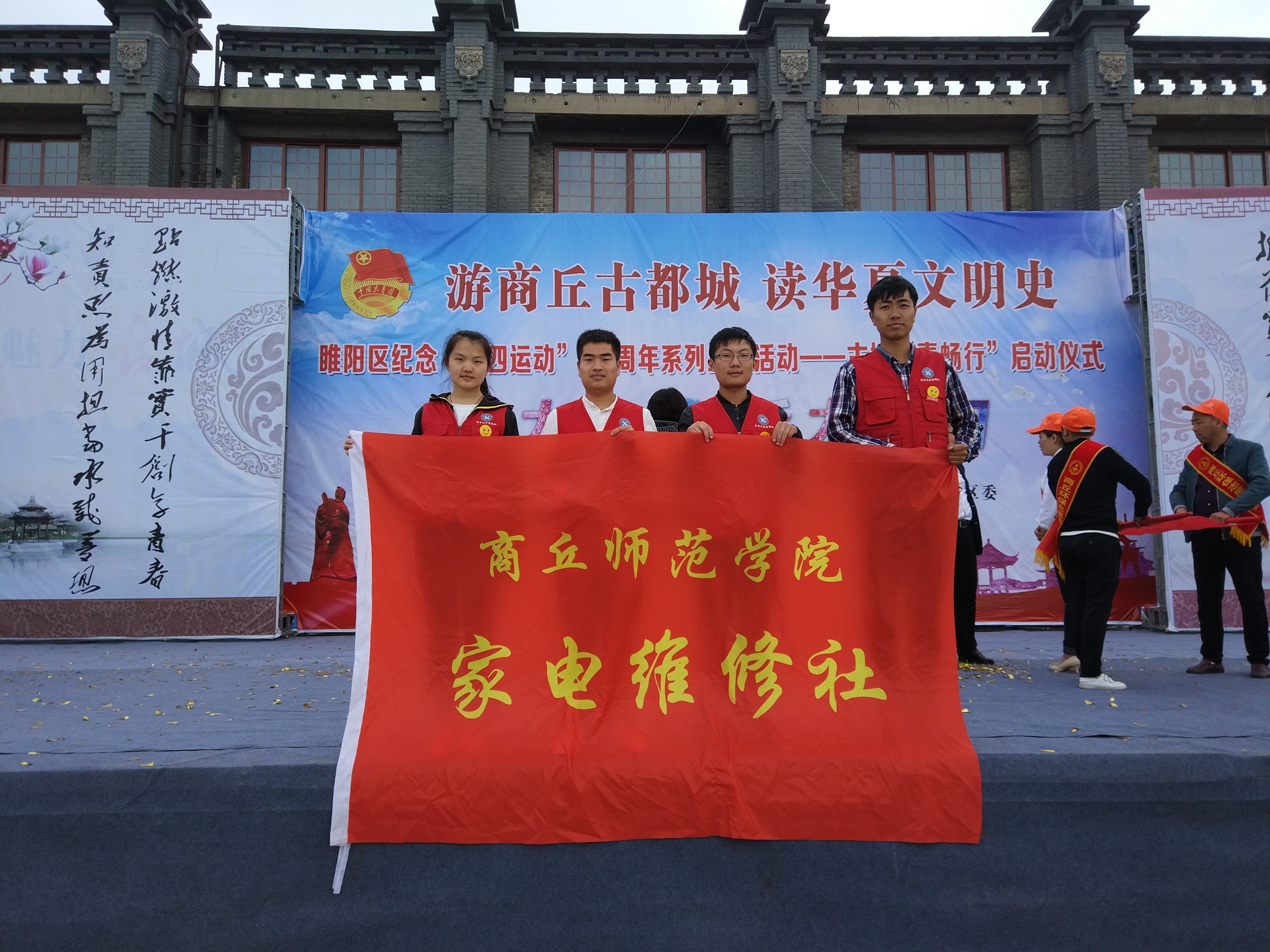 2017年5月4日,威廉williamhill的社团---家电义务维修社应邀参加由共青团商丘市委、中共睢阳区委主办,共青团睢阳区委承办的《游商丘古都城读华夏文明史》睢阳区纪念“五四”运动98周年系列主题活动——古城“青畅行”启动仪式,仪式在商丘古城工业遗产园广场举行。