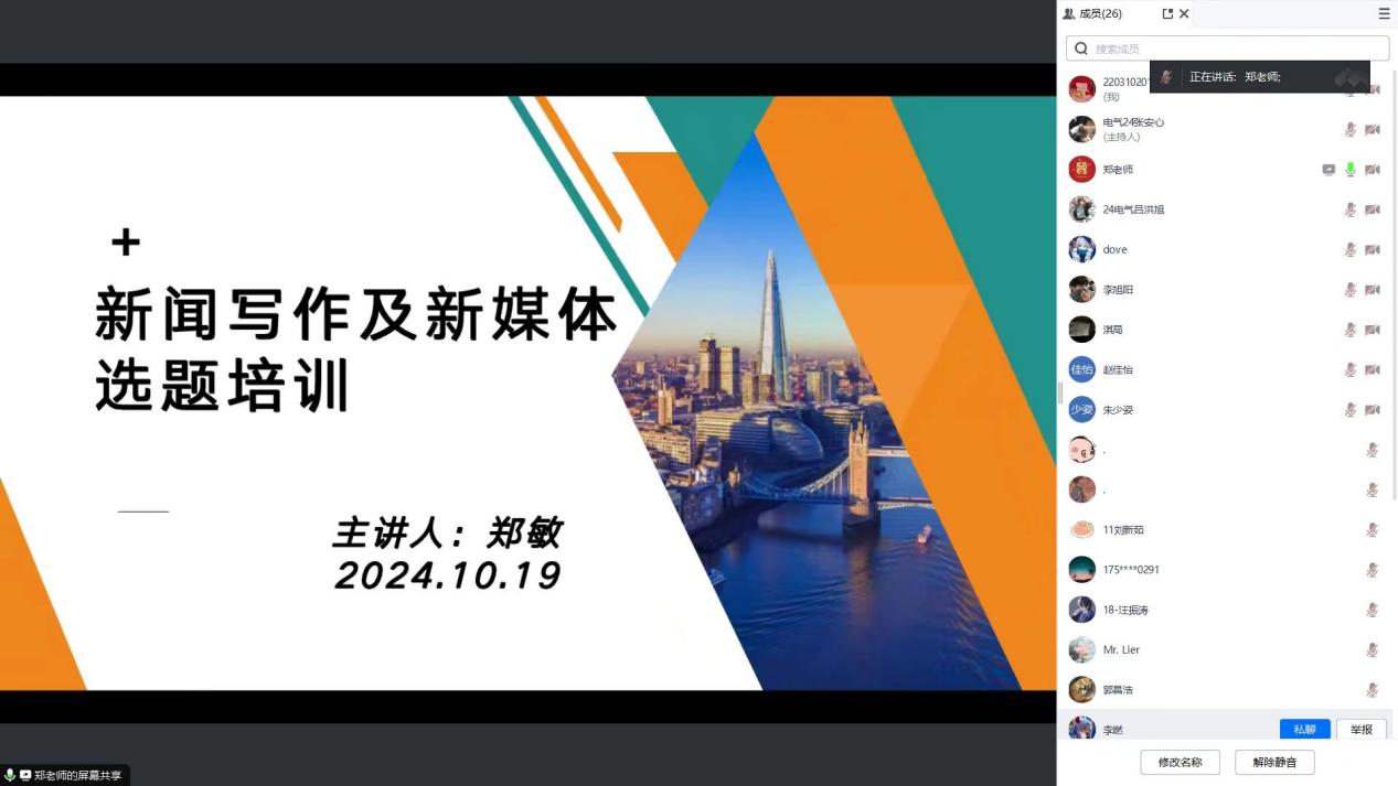 为进一步提升学生团队新闻宣传水平,增强学院宣传队伍业务能力,威廉williamhill于10月19日晚上8点,在腾讯线上会议召开2024年新闻写作及新媒体选题培训会。本次培训会特邀学院宣传专员郑敏老师授课,学院青梦宣传中心所有学生参加了本次培训。