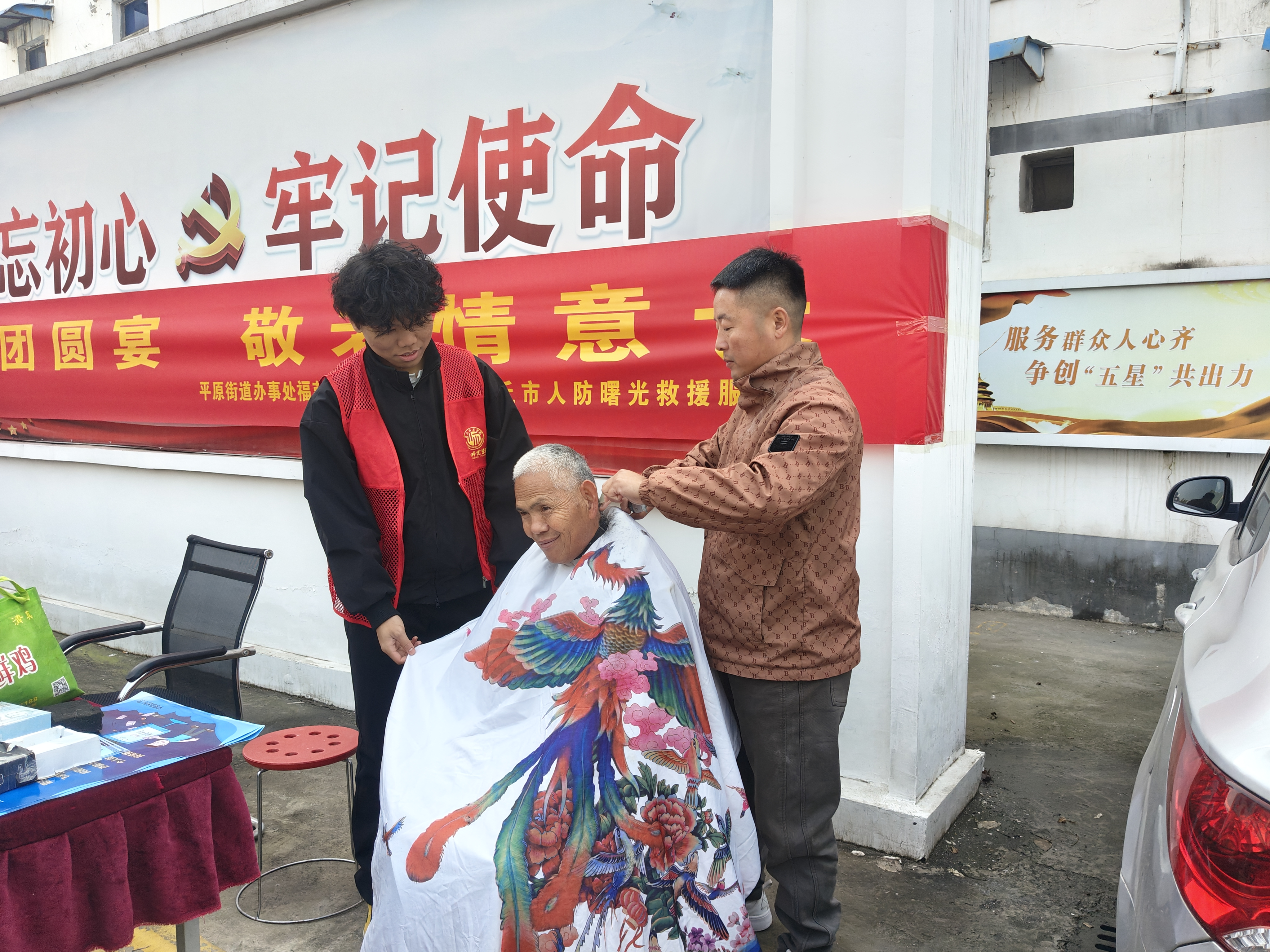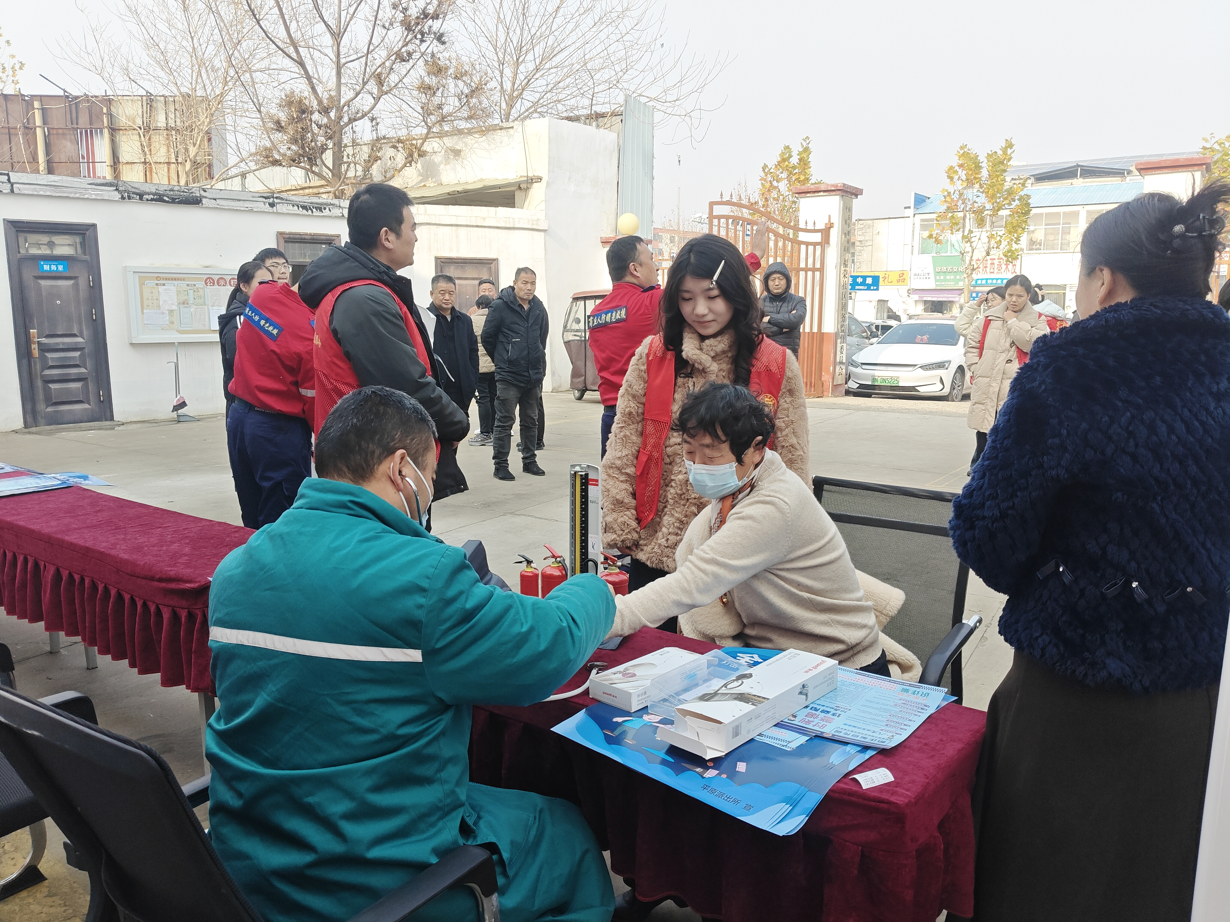 室外现场,学院志愿者们化身“服务员”与“暖心人”,分区域开展志愿服务。健康服务点位前,志愿者们协助医护人员为56名老人测量血压,记录数据;理发服务点位处,协助理发师为环卫工人准备工具、整理发容;消防宣讲点位前,协助消防员为社区人员宣传讲解、普及知识。