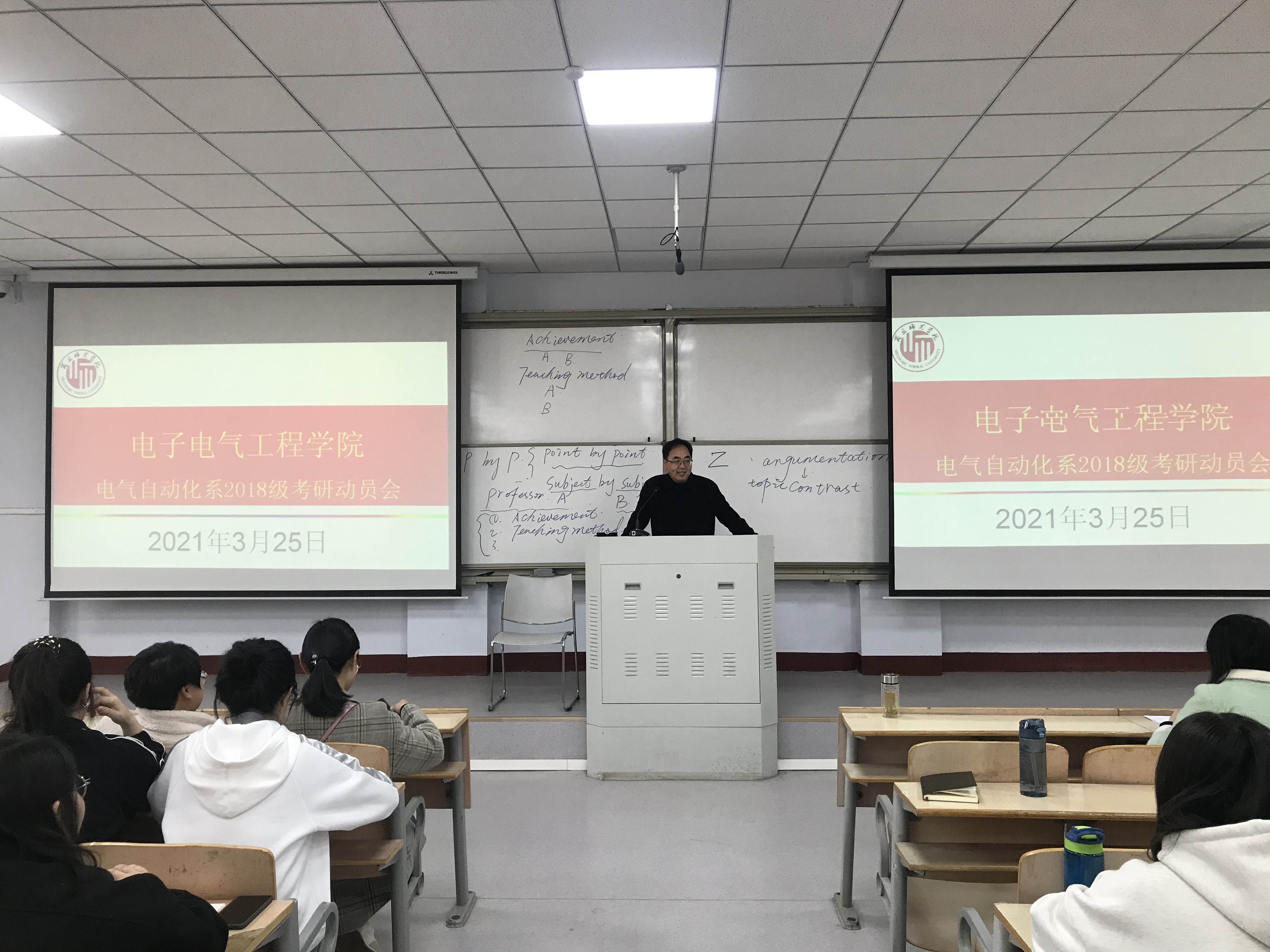 为指导威廉williamhill电气自动化系2018级学生备考全国硕士研究生招生考试,3月25日,电气自动化系在william威廉中文(睢阳区校区)1号楼308室召开学生考研动员会,会议有学院电气自动化系老师贾廷见、贾满满、陈圆圆、孙莉娟、张艳、贺敬岩及电气自动化系2018级全体同学参加,系主任贾廷见主持会议。