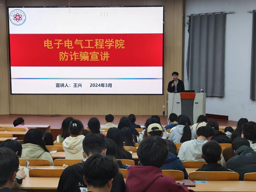 3月22日,我院在物电楼报告厅召开防诈骗宣讲,宣讲会由学院资助专员王兴主讲,2022级、2023级学生代表参会。