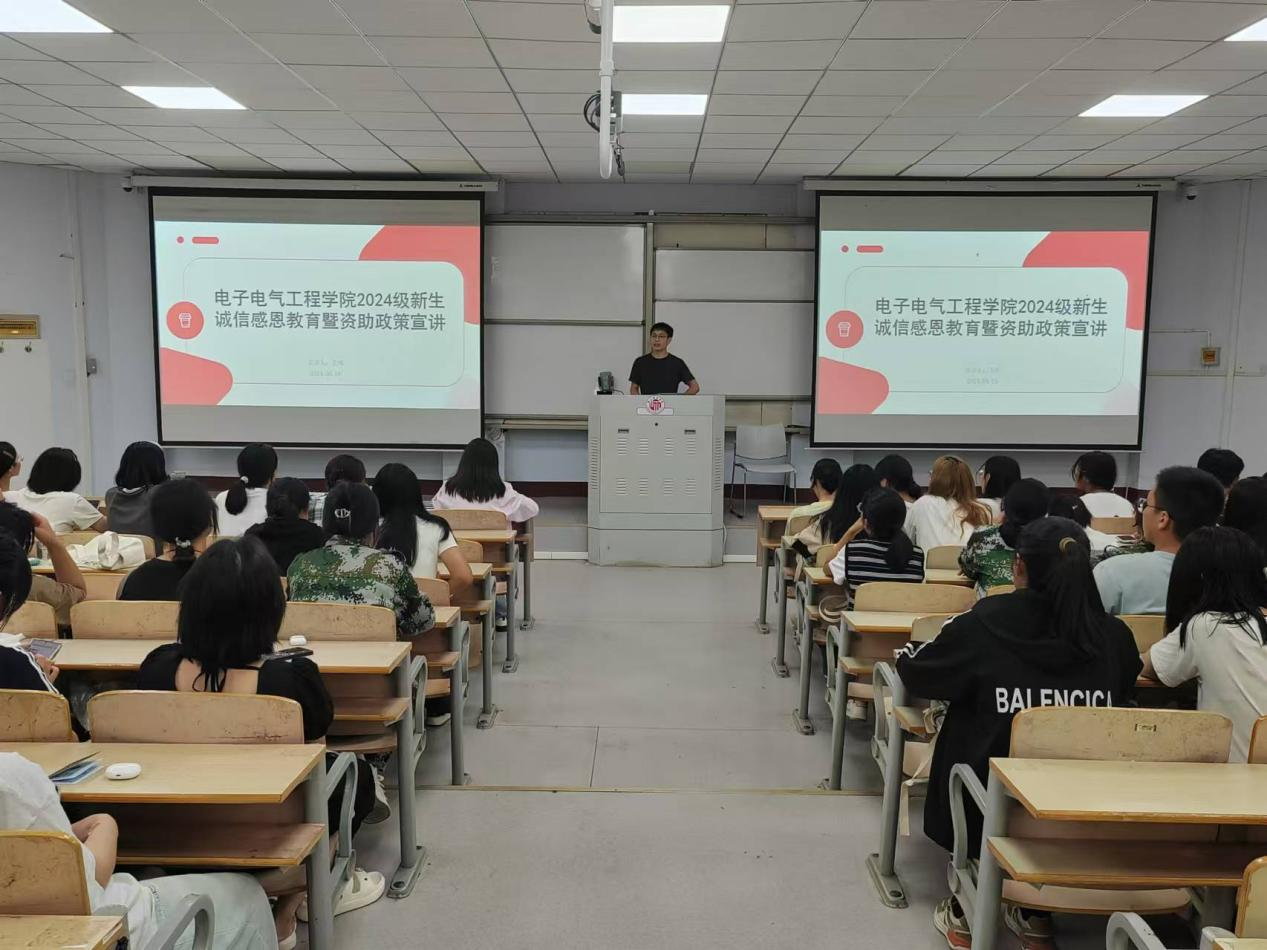 9月19日,我院在睢阳校区召开2024级新生诚信感恩教育暨资助政策宣讲活动。会议由学院资助专员王兴老师主讲, 2024级全体新生参会。