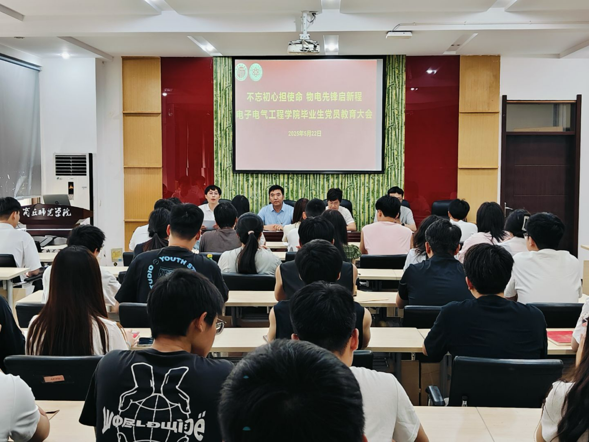5月22日,我院于睢阳校区开展“不忘初心担使命 物电先锋启新程”2025届毕业生党员教育大会。院党委书记李琳、副书记蒋玉涛、辅导员王灿祥及毕业生党员参会,会议由组织员王兴主持。