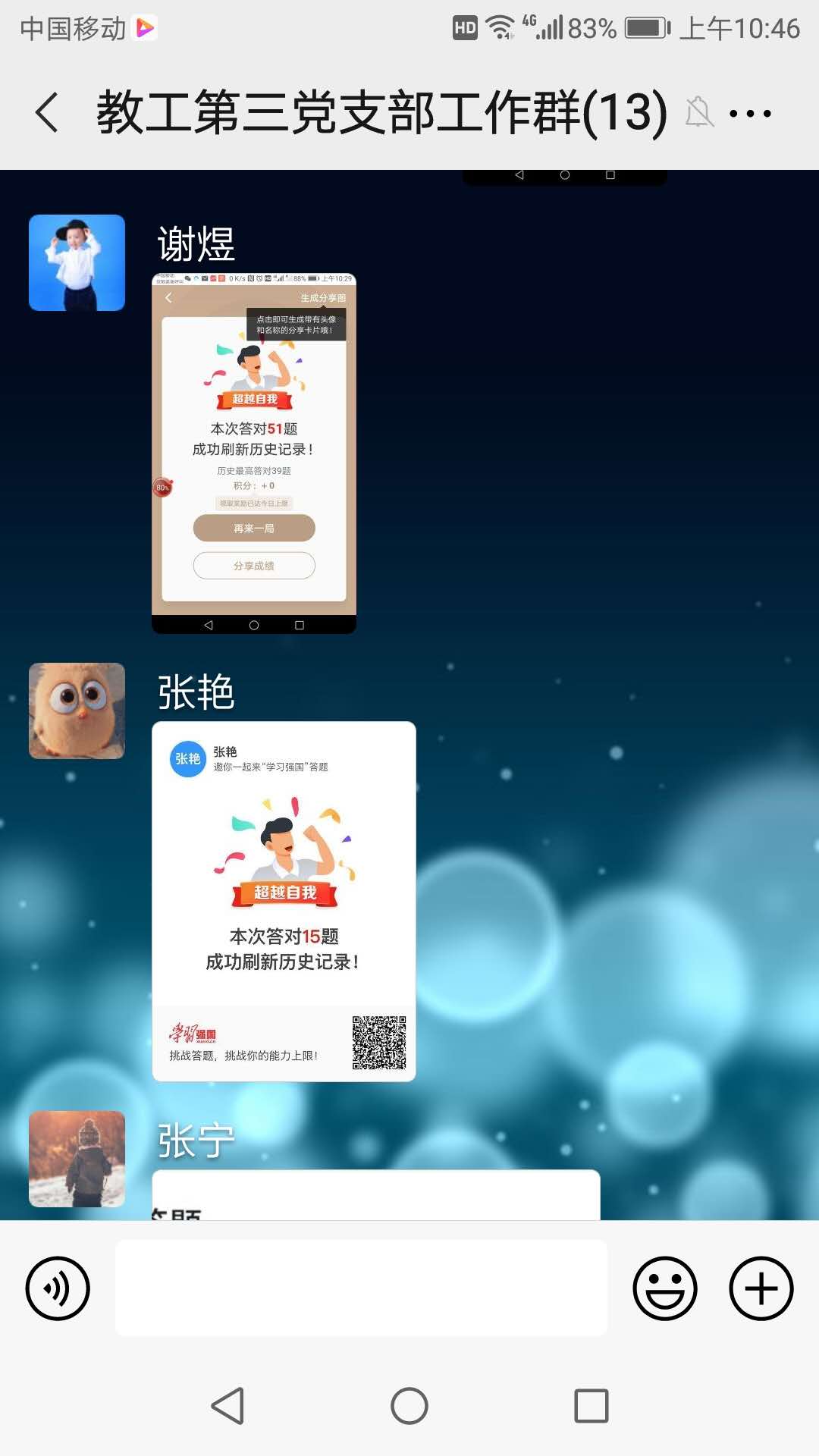 答题挑战赛以“学习强国”学习平台手机APP“挑战答题”为基本形式,采取现场答题和线上答题形式相结合方式。现场比赛和线上比赛的教职工和学生党员,在同一时间分支部和学系开展答题竞赛,以支部和学系为单位进行上报汇总。