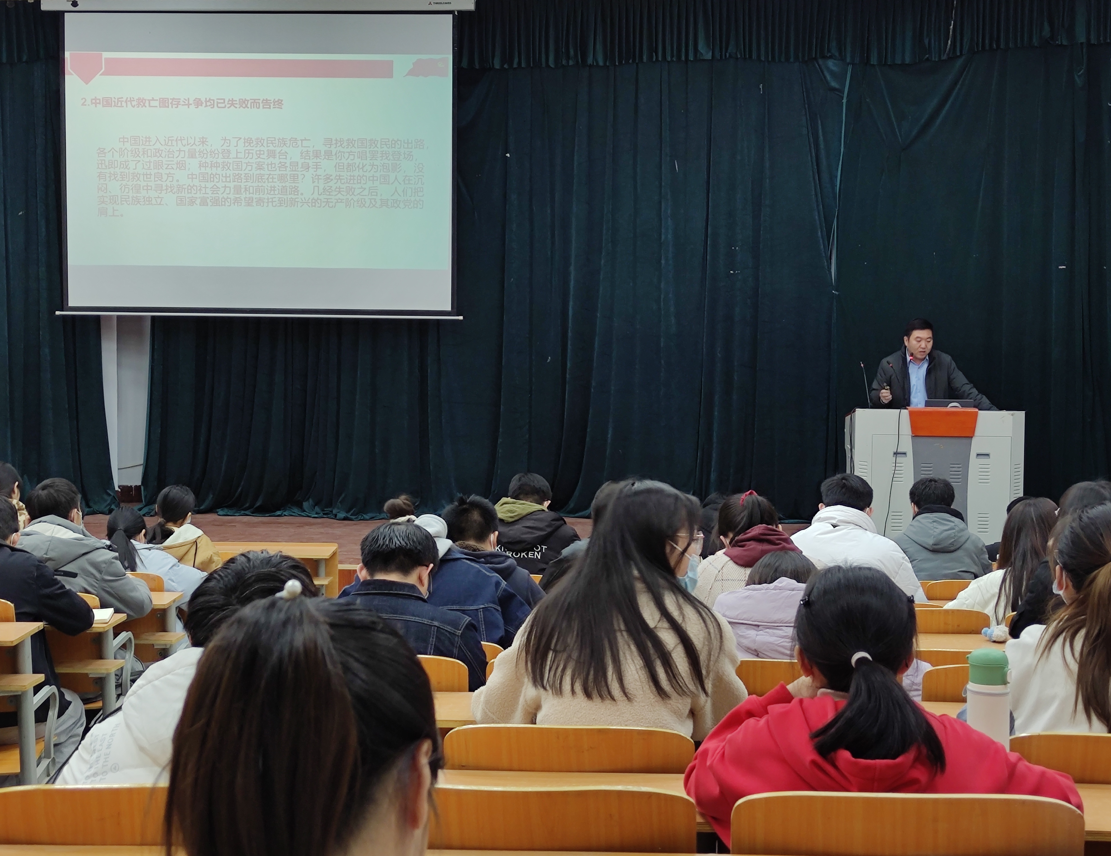 课上,蒋玉涛围绕中国共产党成立的社会历史条件和中共一大召开情境的历史回潮、中国共产党成立的伟大历史意义、中共一大的建党精神等四个方面进行了讲解,列举了各时期中国被侵略的历史事件,引出中共一大召开情景的历史回潮,阐述了中共一大与建党精神的内涵、重要意义。同时,他指出“中共一大”是中国共产党成立的重要标志,具有划时代的意义,是中国历史上“开天辟地的大事变”,它使中国革命有了坚强的领导核心和科学的指导思想,为中国人民指明了斗争的目标和走向胜利的道路,并且形成了坚持真理、践行初心、担当使命、不怕牺牲、英勇斗争、对党忠诚、不负人民的伟大建党精神。