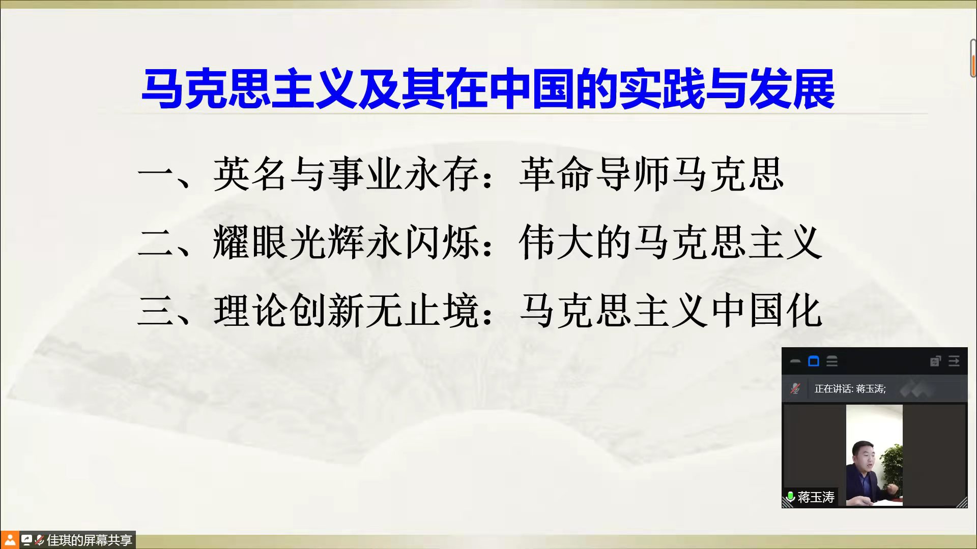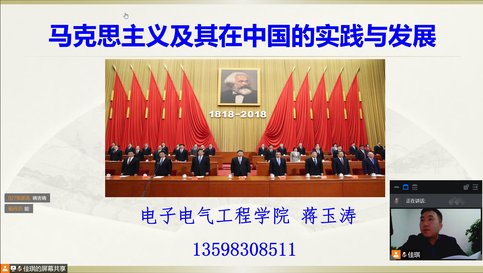 课上,蒋玉涛从“马克思的生平经历、马克思主义的原理与启迪、马克思主义中国化的理论创新”等三个方面向同学们进行详细深入的讲解。接着,他以革命导师马克思的人生境遇为引子,阐释了马克思的思想转变以及马克思主义的产生背景,并结合当今社会实例与历史人物史实,详细论述了马克思主义的原理与启迪,以及如何用历史分析法评价历史人物。最后,蒋玉涛结合数据图表向同学们展示了马克思主义理论创新的时间脉络,并就“马克思主义中国化的必要性”这一话题与同学们展开讨论。