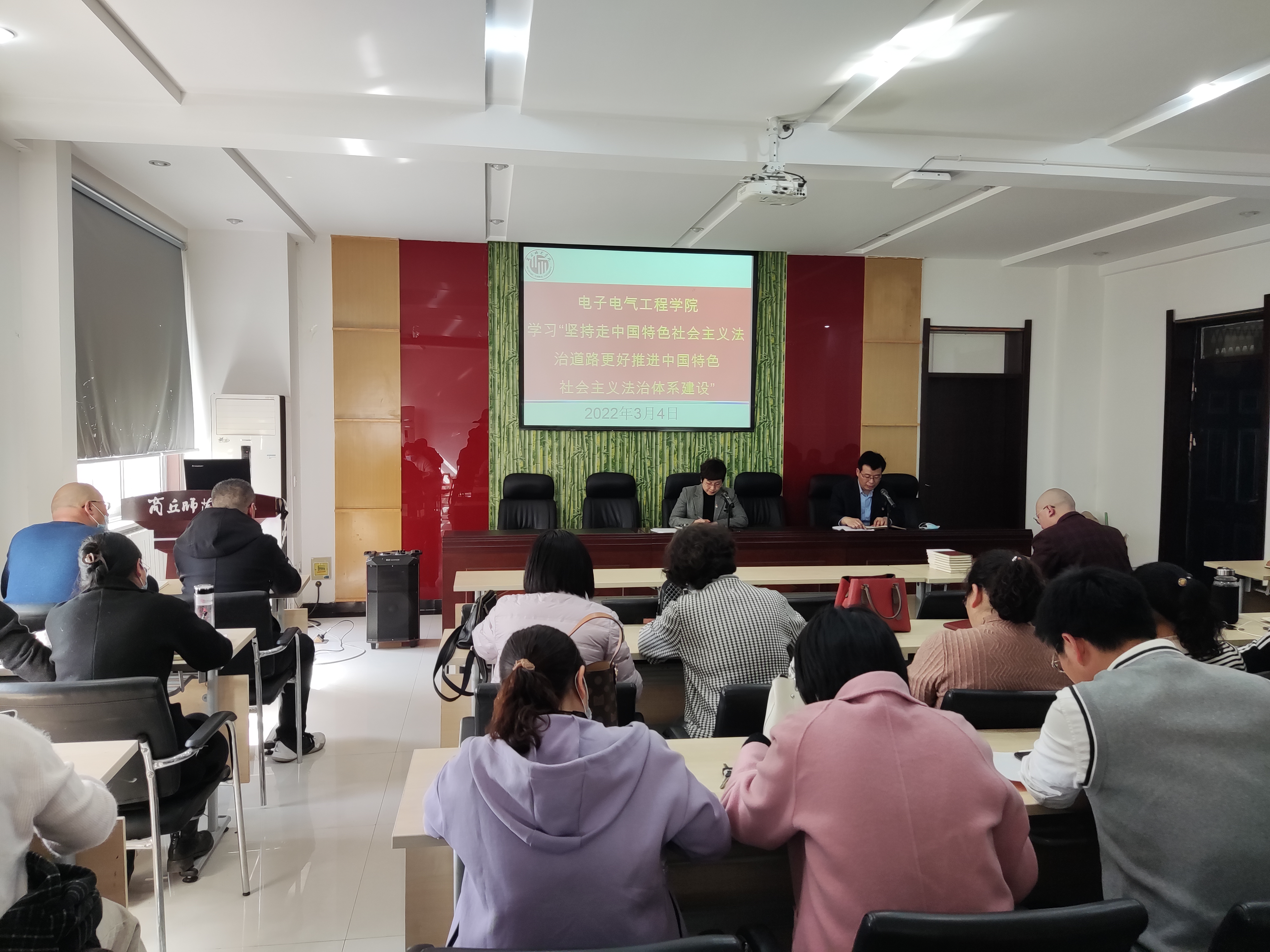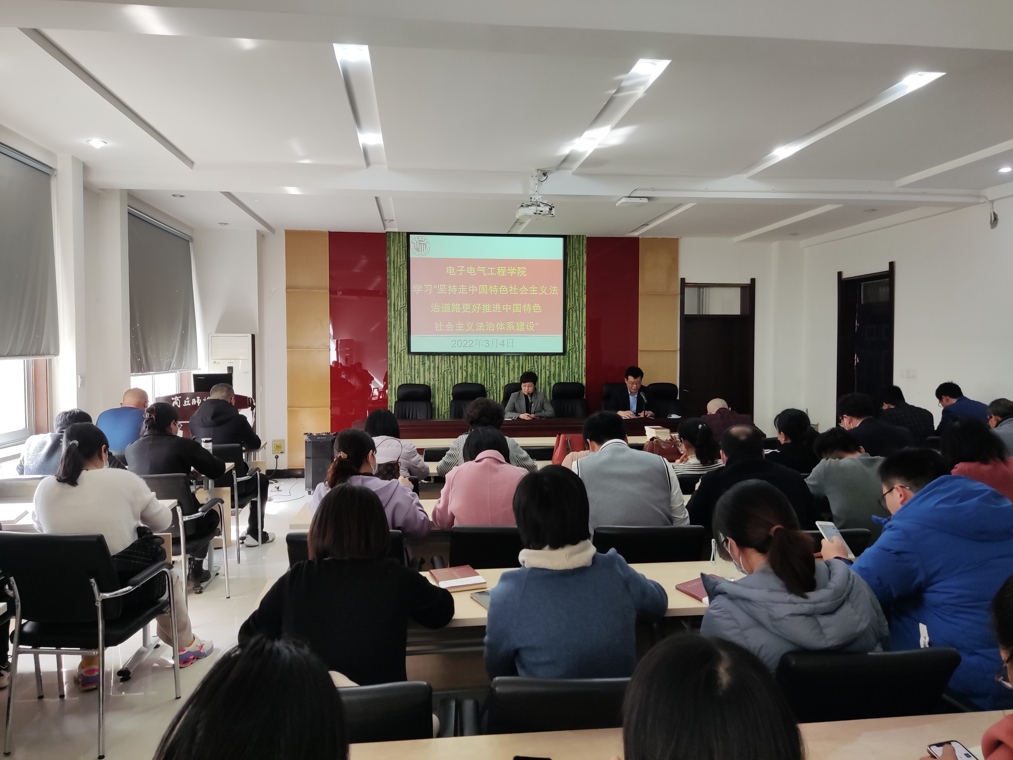 会上,李琳领学了习近平总书记的重要文章《坚持走中国特色社会主义法治道路,更好推进中国特色社会主义法治体系建设》。她讲到,习近平总书记关于中国特色社会主义法治建设的重要论述是指导新时代法治中国建设的行动指南,要求全体教职工:一、要高度重视政治理论学习,深学笃行习近平法治思想,坚定不移走中国特色社会主义法治道路。二、要提高法治观念,做到学法、懂法、用法,筑牢法纪底线,严于律己,立德树人,始终保持教师本色。