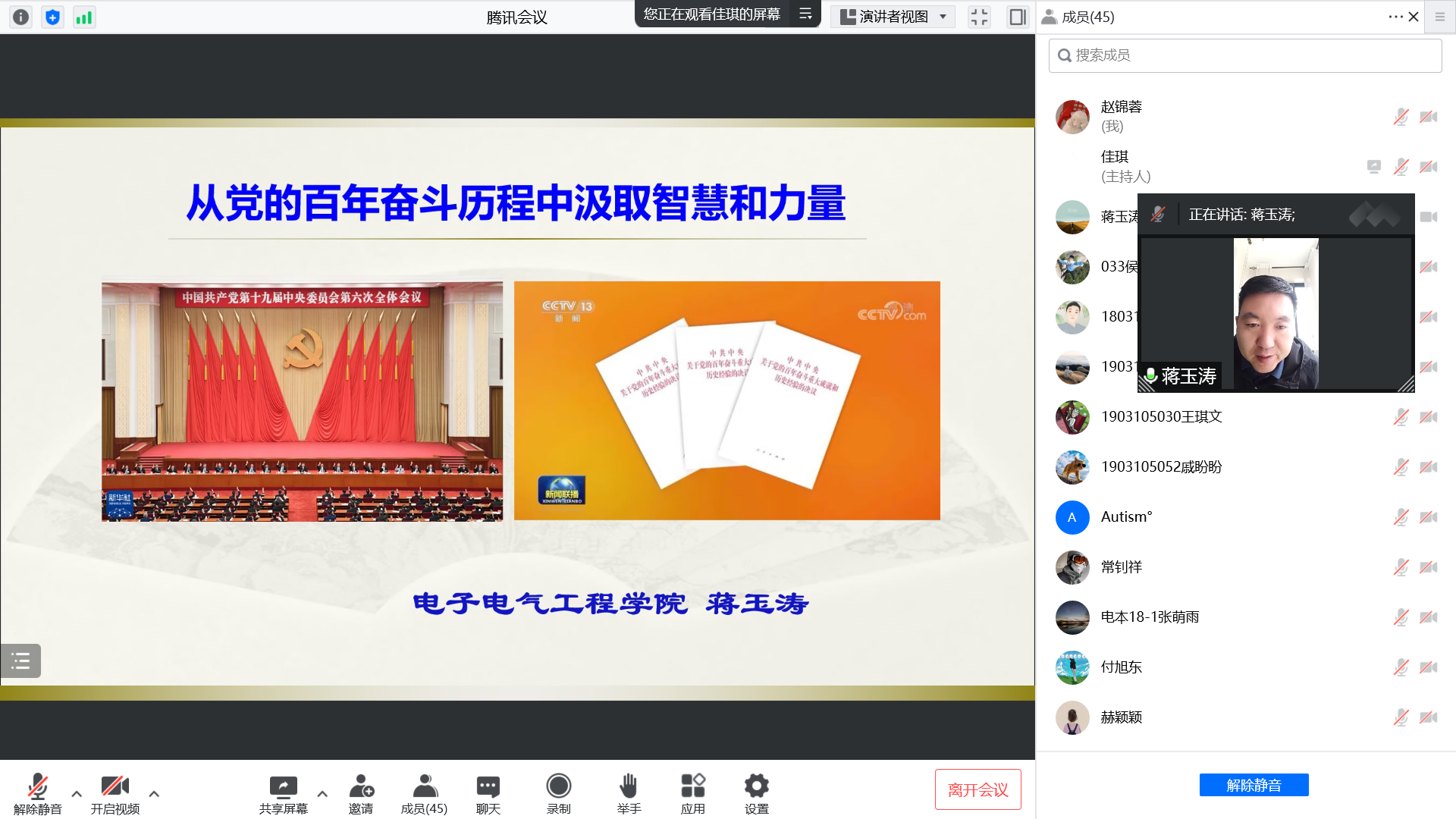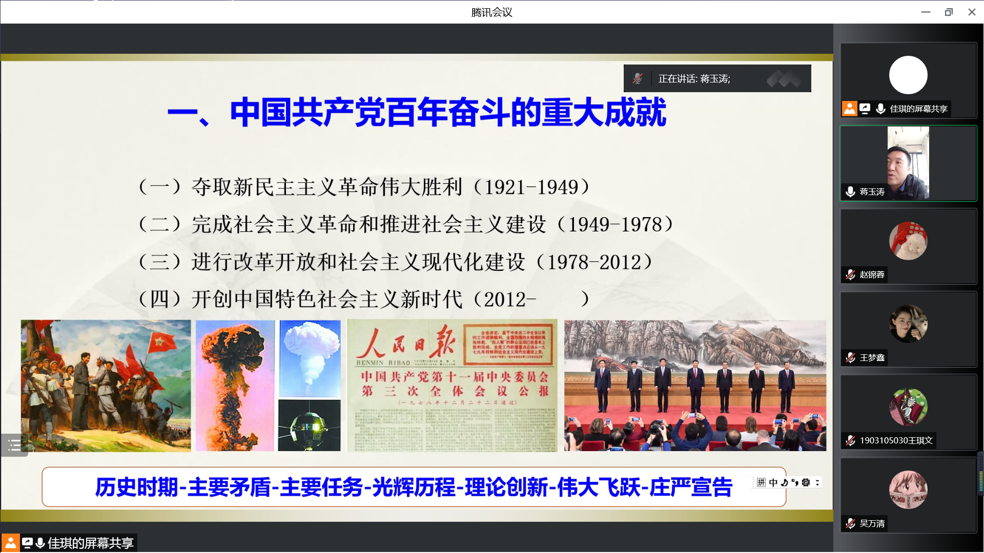 5月15日,威廉williamhill通过腾讯会议方式开展《从党的百年奋斗历程中汲取智慧和力量》党课学习活动。本次党课由学院党委副书记蒋玉涛主讲。