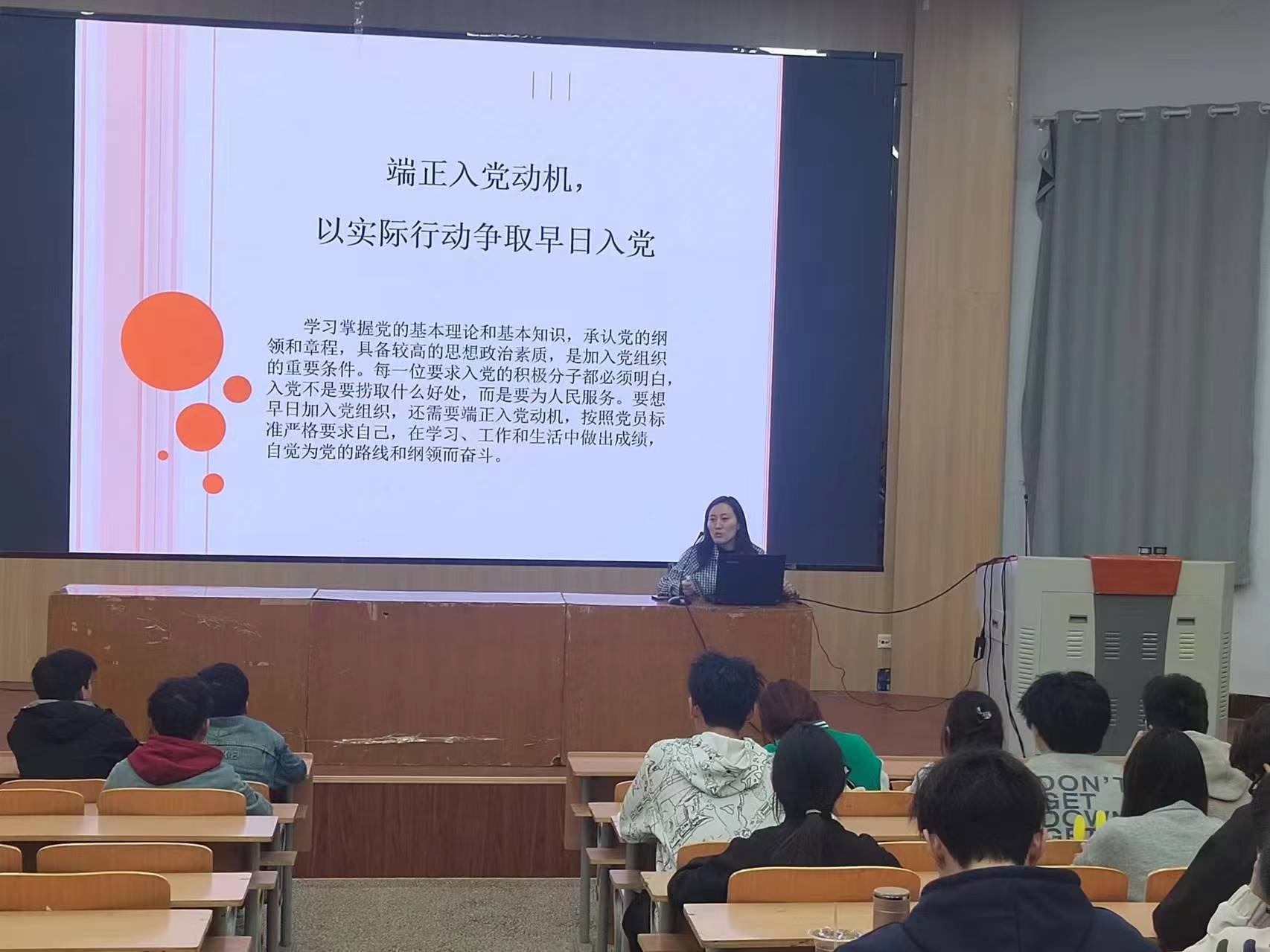 4月9日,我院学生第一党支部书记张佳琪以《端正入党动机以实际行动争取早日入党》为题为第54期入党积极分子上党课。