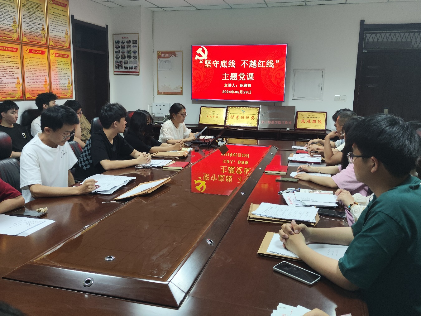 5月29日,我院学生第四支部书记孙莉娟在睢阳校区为支部党员上党课。党课主题为“坚守底线 不越红线”。