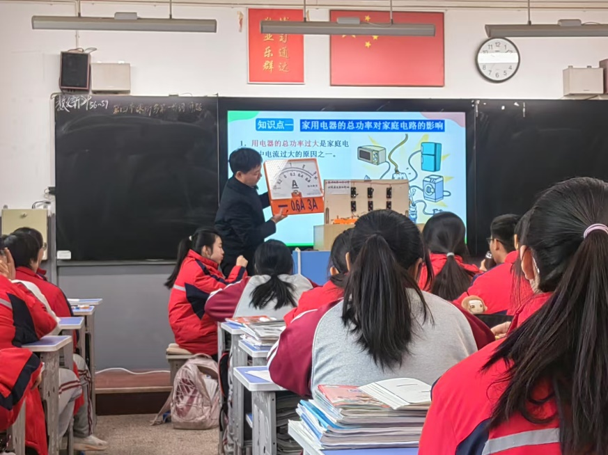 最后,同学们走进教室,观摩了崔老师的一节复习课《家庭电流过大的原因》。课堂初始环节,崔老师通过提问进行了知识点的回顾。紧接着,由几个视频来引出课堂探讨的问题,同时诙谐幽默的动画视频也调动学生学习的气氛。在问题探讨阶段,崔老师进行实验演示,通过类比推理得出结论。在课堂总结阶段,学生通过板书存在的一些问题,师生统统解决进行查漏补缺。