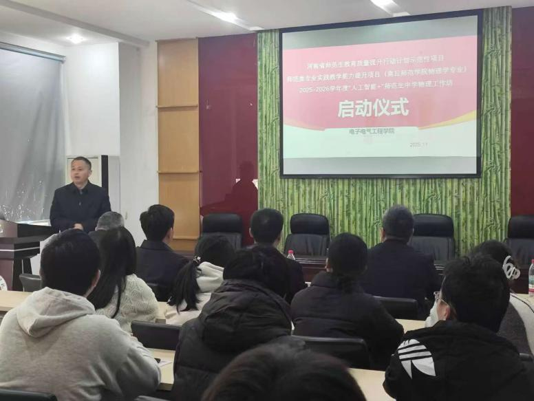11月26日,我院举办的河南省师范生教育质量提升行动计划示范性项目——william威廉中文物理学专业实践教学能力提升暨“人工智能+”师范生中学物理工作坊开班仪式在睢阳校区物电楼208举行。院长赵纲领、副书记蒋玉涛、物理系主任刘伟民、物理系副主任刁心峰及班主任李莉参加,出席此次启动仪式的还有商丘市中学优秀教师和工作坊全体学员,启动仪式有刘伟民主持。