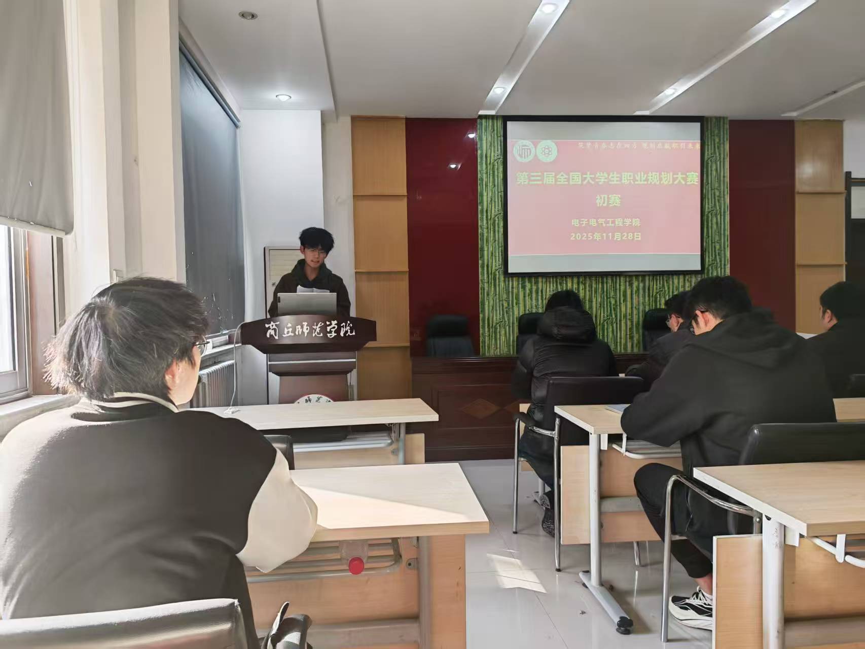 11月28日,第三届大学生职业规划大赛院级初赛在物电楼208会议室成功举办。本次赛事由学院团委学生会就业部主办,旨在搭建职业规划展示平台,挖掘学生就业潜力,为校赛选拔优质参赛选手。学院党委副书记蒋玉涛、学工办主任孙莉娟及辅导员郑敏、马煊贺、李小亚、王灿祥等老师担任评委。就业部成员郝荣彬主持。