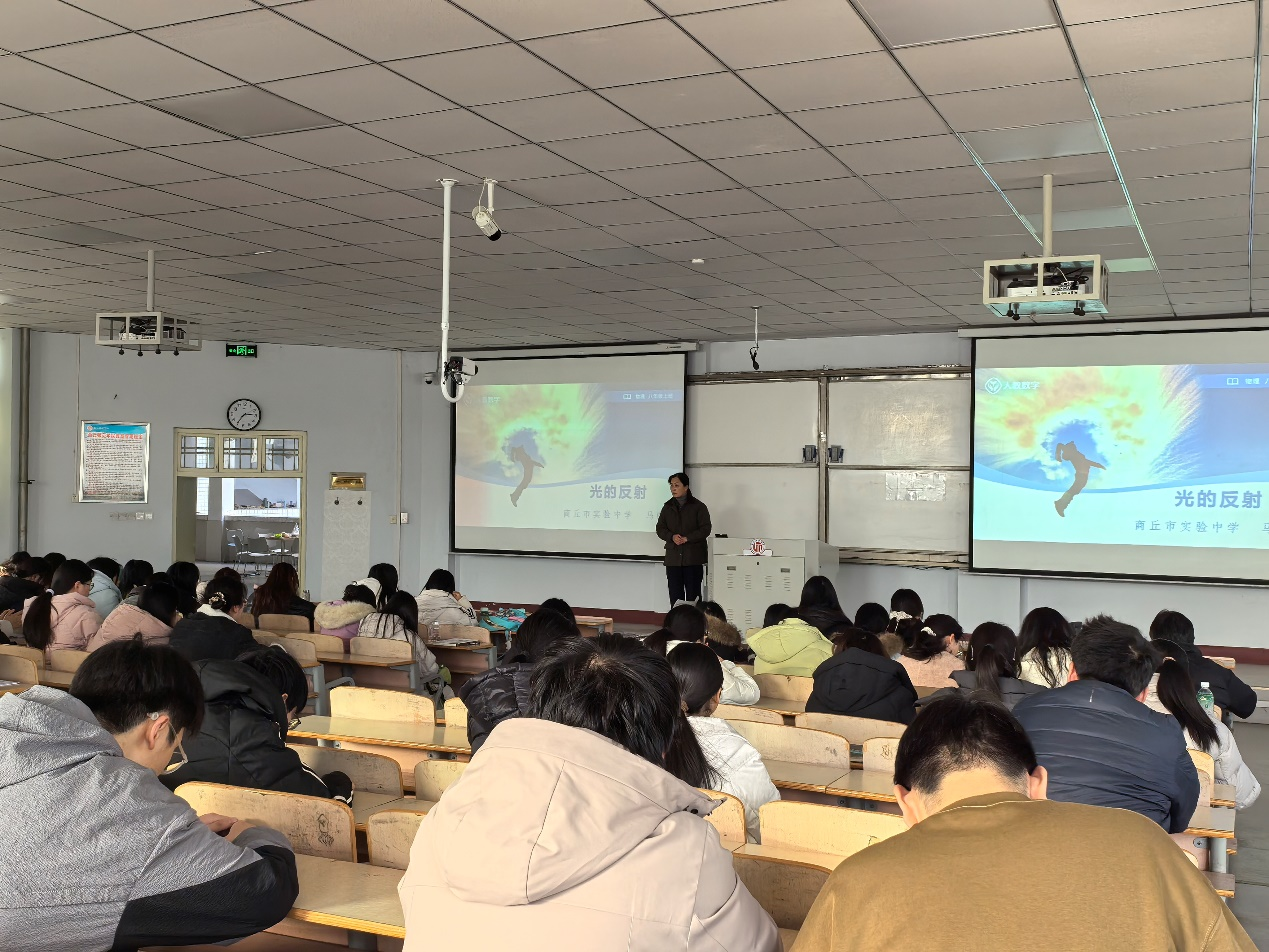 在报告会上,马老师深入阐述了微型课设计的核心要点,强调实验类微型课应始终秉持“以学生为中心”的理念。教学需首先明确清晰、具体的分层学习目标,并紧密结合物理学科核心素养中的“科学探究”“科学态度与责任”等要求,精准把握教学重难点。教学设计应以解决生活中的实际光学问题为导向,增强知识的应用性与亲和力。随后,马老师现场演示了一个简易的光反射实验。借助激光笔、平面镜、量角器等常见器材,引导学生直观观察光线入射与反射的动态过程,自然引出“入射光线”“反射光线”“法线”等关键概念,避免了知识的生硬灌输,实现了现象观察与概念建构的有机衔接。