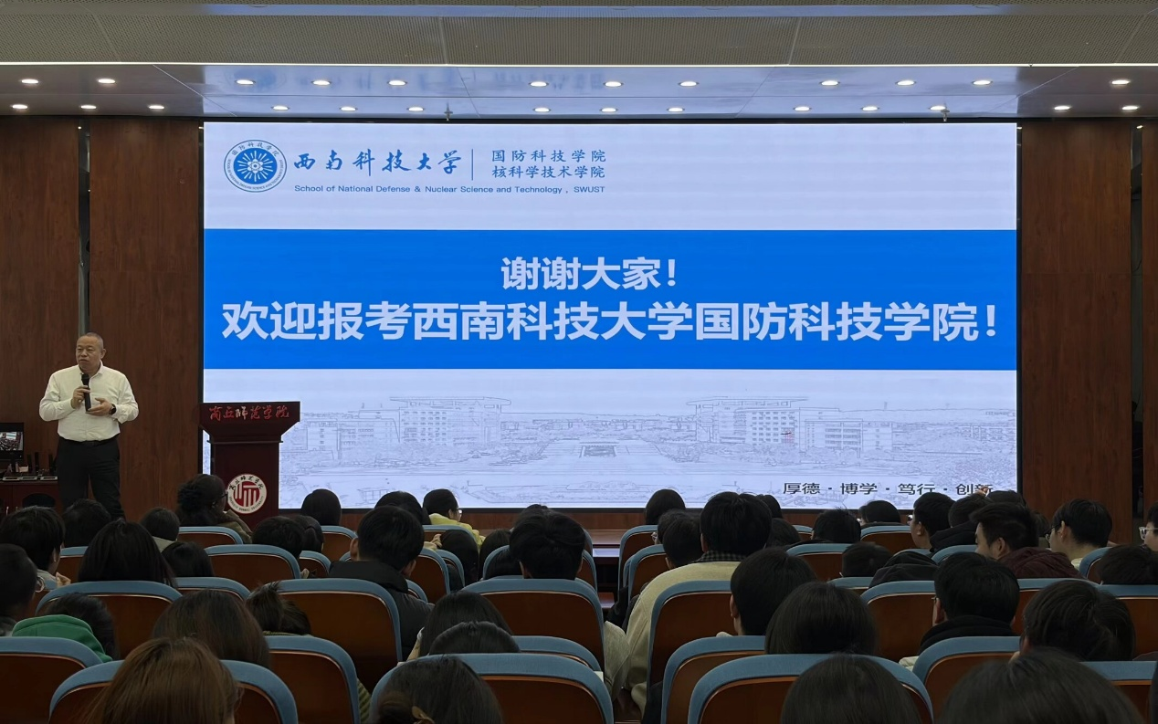 会上,吕会议老师详细介绍了西南科技大学的办学特色与科研平台。学校坐落于中国科技城绵阳,深耕军民融合领域,办学特色鲜明,依托中国工程物理研究院等国家级科研院所,材料科学、工程学、化学等多个学科跻身ESI全球排名前1%。随后,吕会议老师重点解读了国防科技学院学科建设成果,围绕核废物处理、核环境科学、新型含能材料设计等前沿研究方向展开介绍,并展示了学院近年来在《Nature》《Science》等国际顶级期刊上发表的重要学术成果。学院设有核科学与技术一级硕士学位授权点、能源动力专业硕士学位点,科研经费充裕,更连续11年由院士为新生讲授第一课,学术底蕴深厚、科研氛围浓郁。