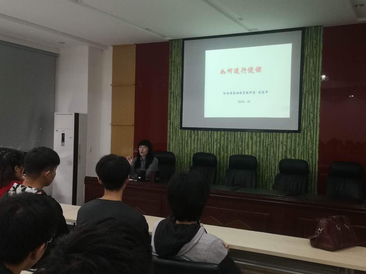 说课作为教师教研的一种活动形式,已被获得广泛的认可。为了让师范生了解说课活动,提高师范生说课技能,提高教育共同体项目培训效果,威廉williamhill特邀请河南省基础教研室物理教研员刘岩华老师于10月15日11点在睢阳校区物理楼208会议室做 《如何进行说课》的报告,物理学18级工作坊全体学生到场听取了刘老师的讲座。