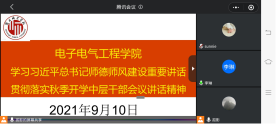 会上,李琳领学了习近平总书记2014年9月9日在北京师范大学师生代表座谈会上的讲话及2016年12月在全国高校思想政治工作会议上的讲话,要求各位老师要深入学习习近平总书记关于师德师风建设的重要讲话精神,坚持教育与育人、言传与身教、潜心问道与关注社会、学术自由与学术规范相统一,争做政治素质过硬、教学科研水平高、适应新时代发展的“四有”好老师。之后传达了学校2021年秋季学期中层干部会议的主要内容。