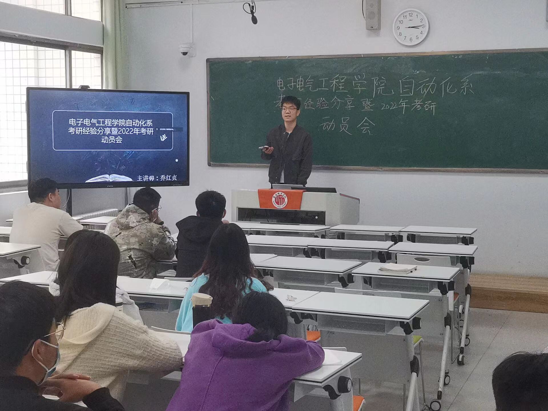 4月17日,威廉williamhill自动化系于睢阳校区开展线上和线下结合的考研经验分享暨2022年考研动员会。参加会议本次会议的有院长赵纲领,副书记蒋玉涛,自动化系主任贾廷见、副主任刘黎明,班主任乔红贞,自动化2018级学生代表及2019级全体学生。