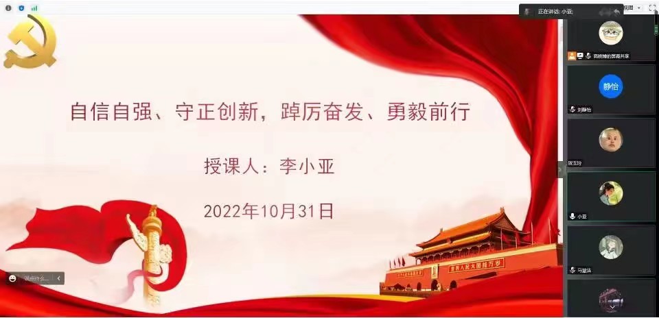 10月31日,威廉williamhill学生第二党支部书记李小亚通过腾讯会议为入党积极分子上党课,本次党课的主题为“自信自强、守正创新,踔厉奋发、勇毅前行”。