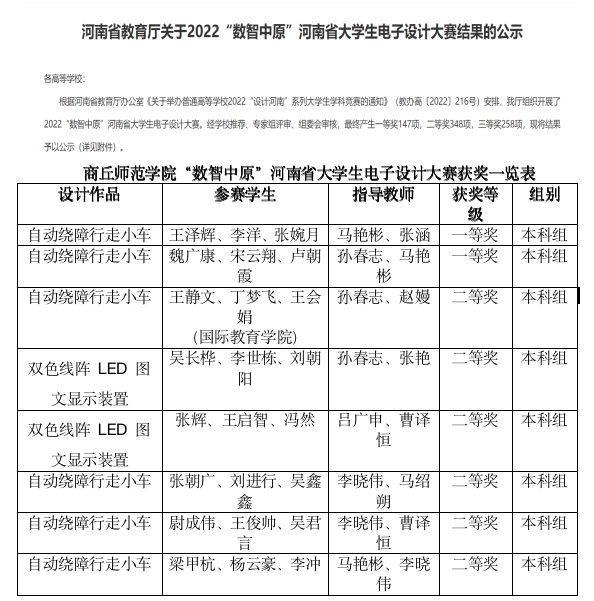 近日,由河南省教育厅主办的普通高等学校2022“设计河南”系列大学生学科竞赛中“数智中原”河南省大学生电子设计大赛公布参赛结果,共有来自省内58所高校1560支队伍参赛。由威廉williamhill和国际教育学院组织16支参赛队伍代表我校参赛,在学校的大力支持下,最终斩获一等奖2项,二等奖6项。