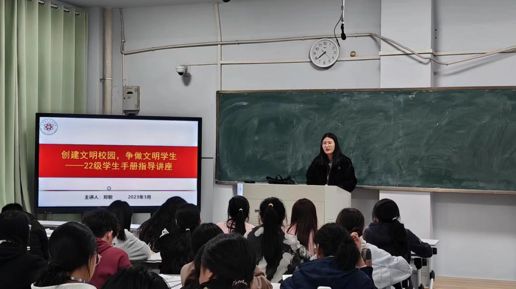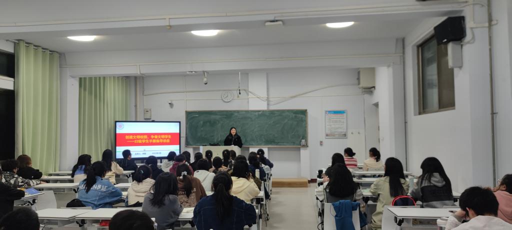 3月14日,我院于睢阳校区开展“创建文明校园,争做文明学生”学生手册指导讲座,22级辅导员郑敏老师担任主讲人,22级学生代表参加。