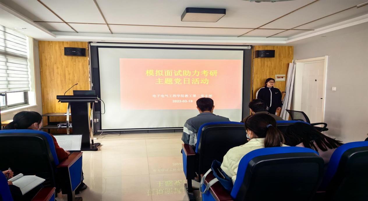 教师第二党支部于3月19日开展“模拟面试 助力考研”主题党日活动。结合专业发展和学生实际需求,邀请党员教师对2019级考研复试学生进行一对一精准帮扶。活动主要内容分为三部分:一是准备复试的学生进行自我介绍;二是教师根据往年面试题目进行提问;三是教师对学生进行一对一精准点评和帮扶。