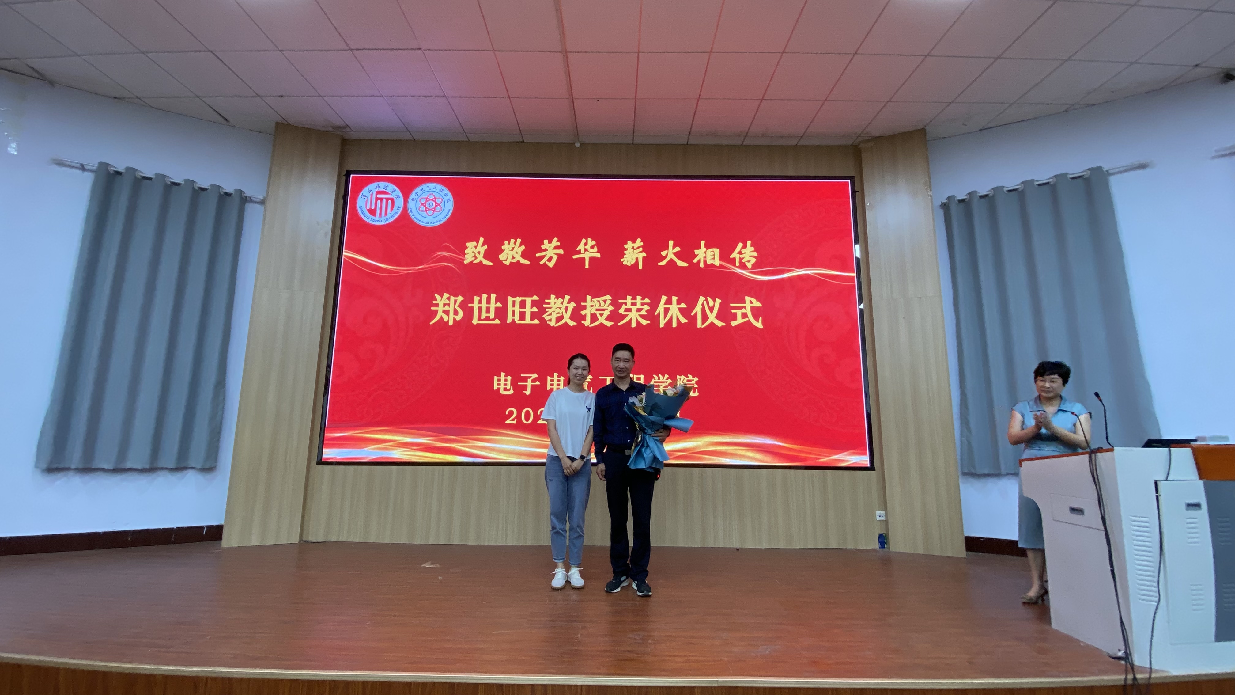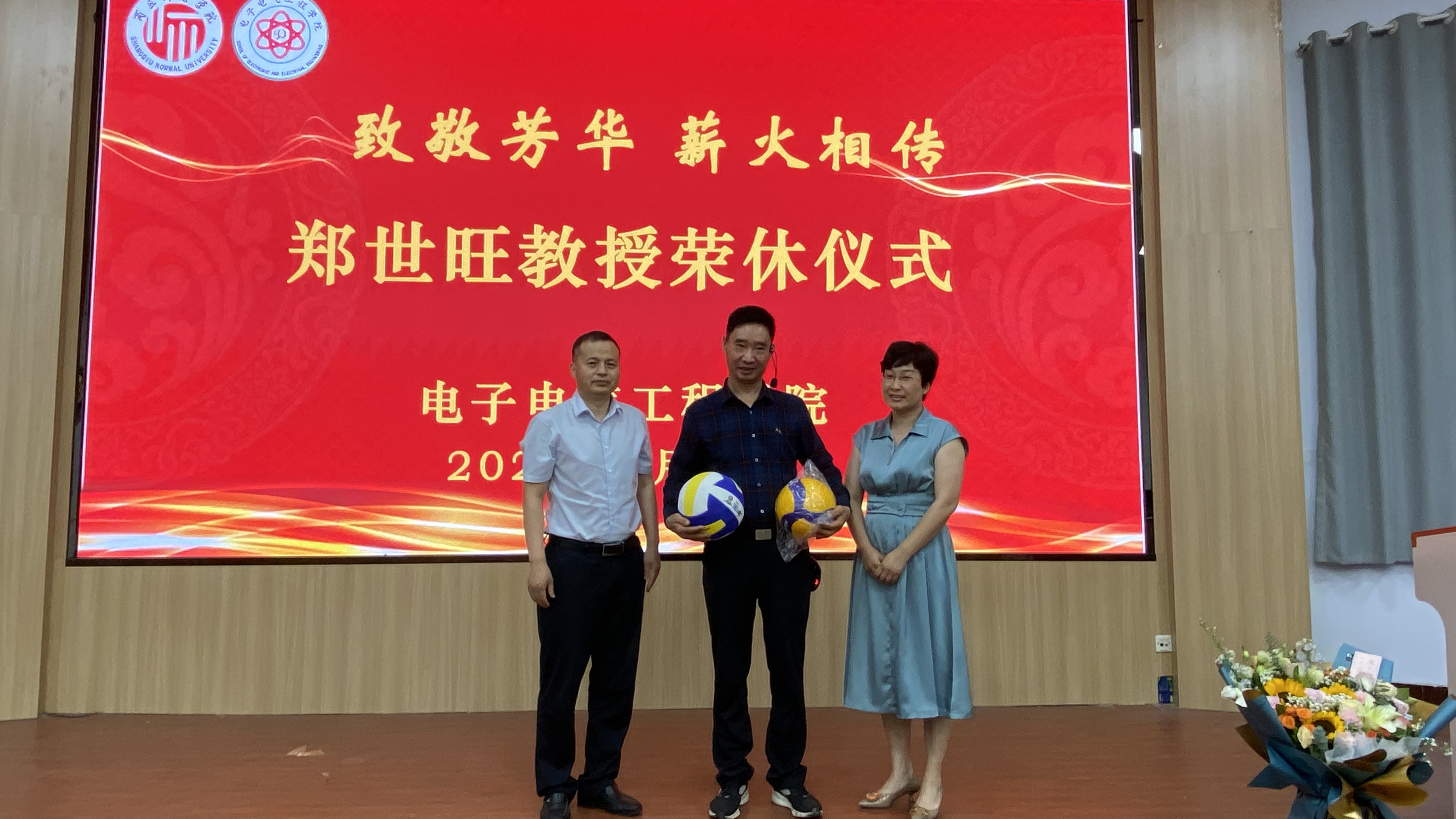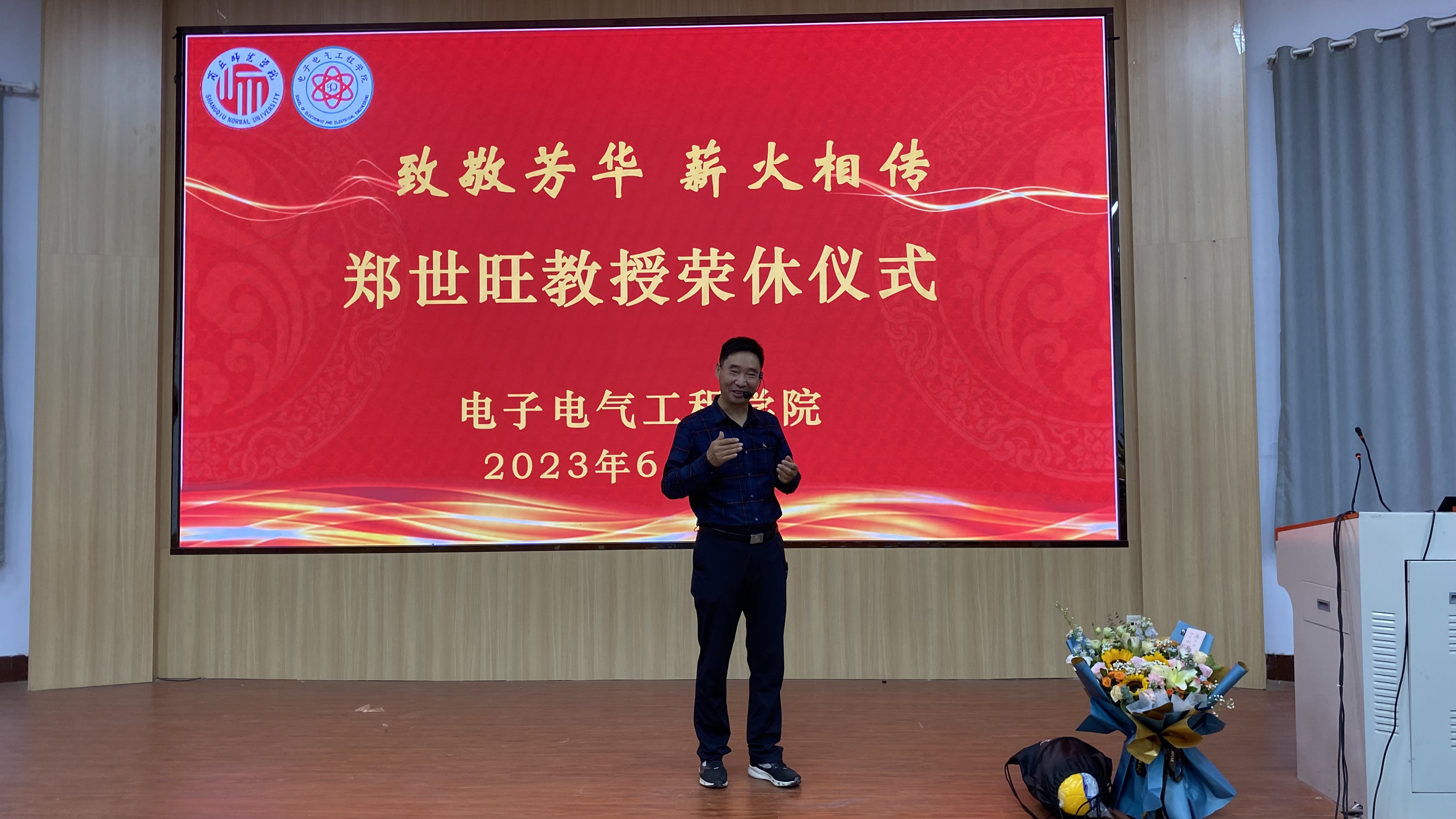 仪式上,老师们通过制作暖心视频分享与郑世旺教授共事以来的点点滴滴。接着,由新进教师代表邹游老师献上鲜花,院工会赠送荣休纪念品。郑世旺教授作荣休发言,他回忆起自己在学院工作以来的种种经历,话语中蕴含着对学院未来发展的美好期望。赵纲领院长作总结讲话,他讲述了郑世旺教授40余年来的教育教学经历和取得的荣誉,并勉励全体教职工要继续发扬郑教授爱岗敬业、孜孜不倦、勇攀高峰的精神品质。