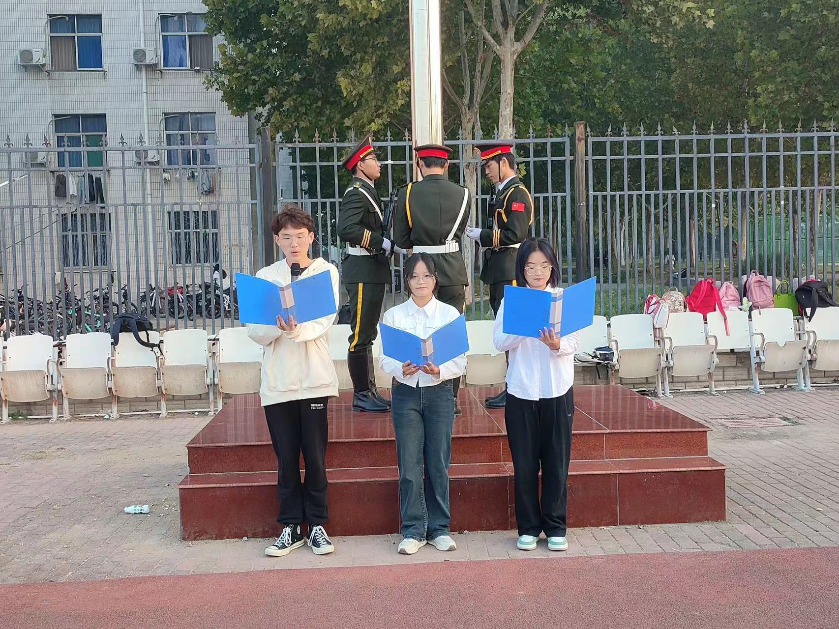早上7点,在全体师生的注目礼下,升旗仪式正式开始。英姿飒爽的国旗护卫队迈着整齐划一、铿锵有力的步伐护送五星红旗走到旗杆下,伴随着激扬的《中华人民共和国国歌》,鲜艳的五星红旗沐浴着清晨第一缕阳光冉冉升起,迎风飘扬。仪式结束后,学生代表史名扬、陈思思、王培带来国旗下朗诵——《星辰大海,以梦为马》。三位同学的朗诵鼓舞人心、催人奋进,鼓励大家坚定信心、迎难而上、勇于追梦,把梦想蓝图变为美好的现实。