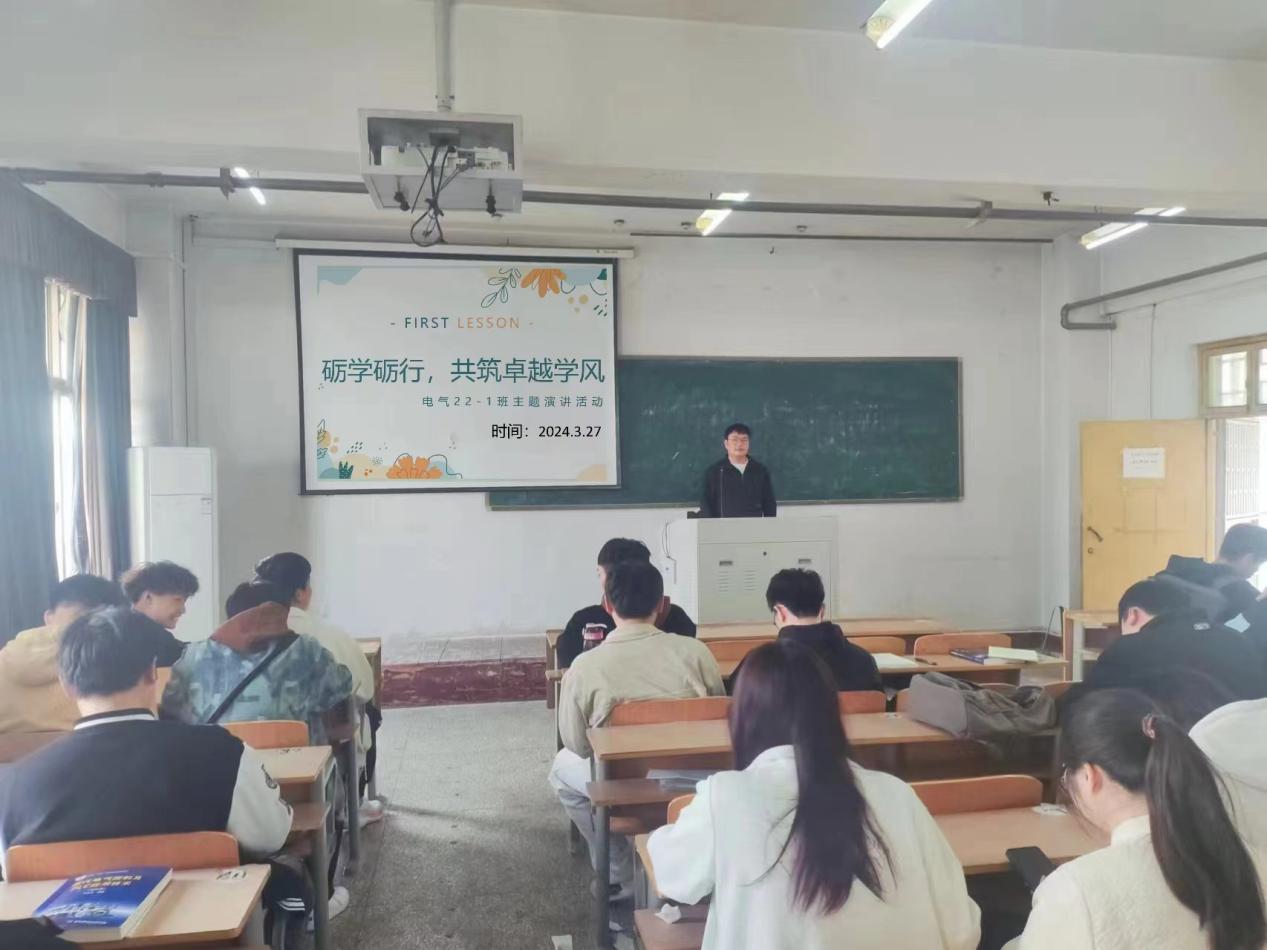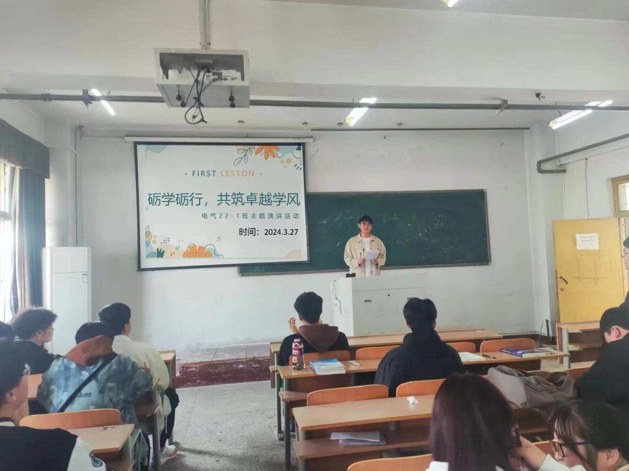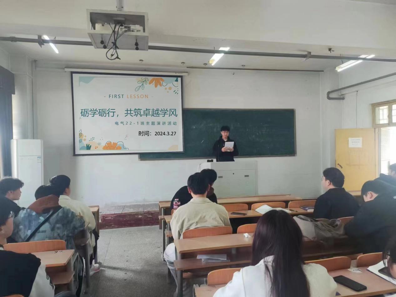 3月27日,电气工程及其自动化22-1班在物电楼602教室举行了“励学励行,共筑卓越学风”演讲比赛。本次比赛由班长刘豪主持,刘世龙、李伟、权筱涵、李云杰、穆子钰、吴佳颖等10位同学参赛,15位宿舍长担任评委。比赛以“励学励行,共筑卓越学风”为主题,旨在加强班级学风,营造积极向上的学习氛围,提高学生的综合素质。