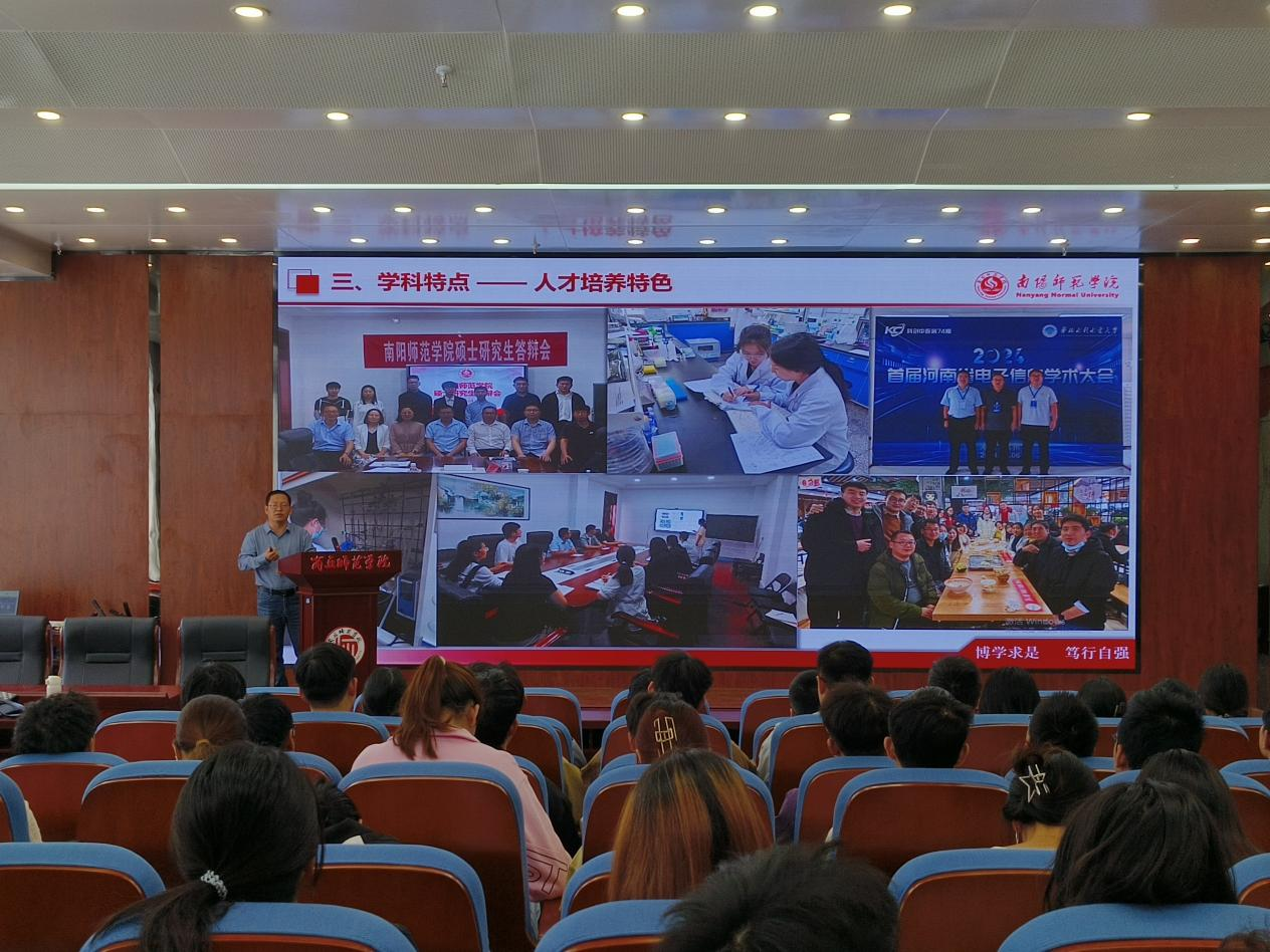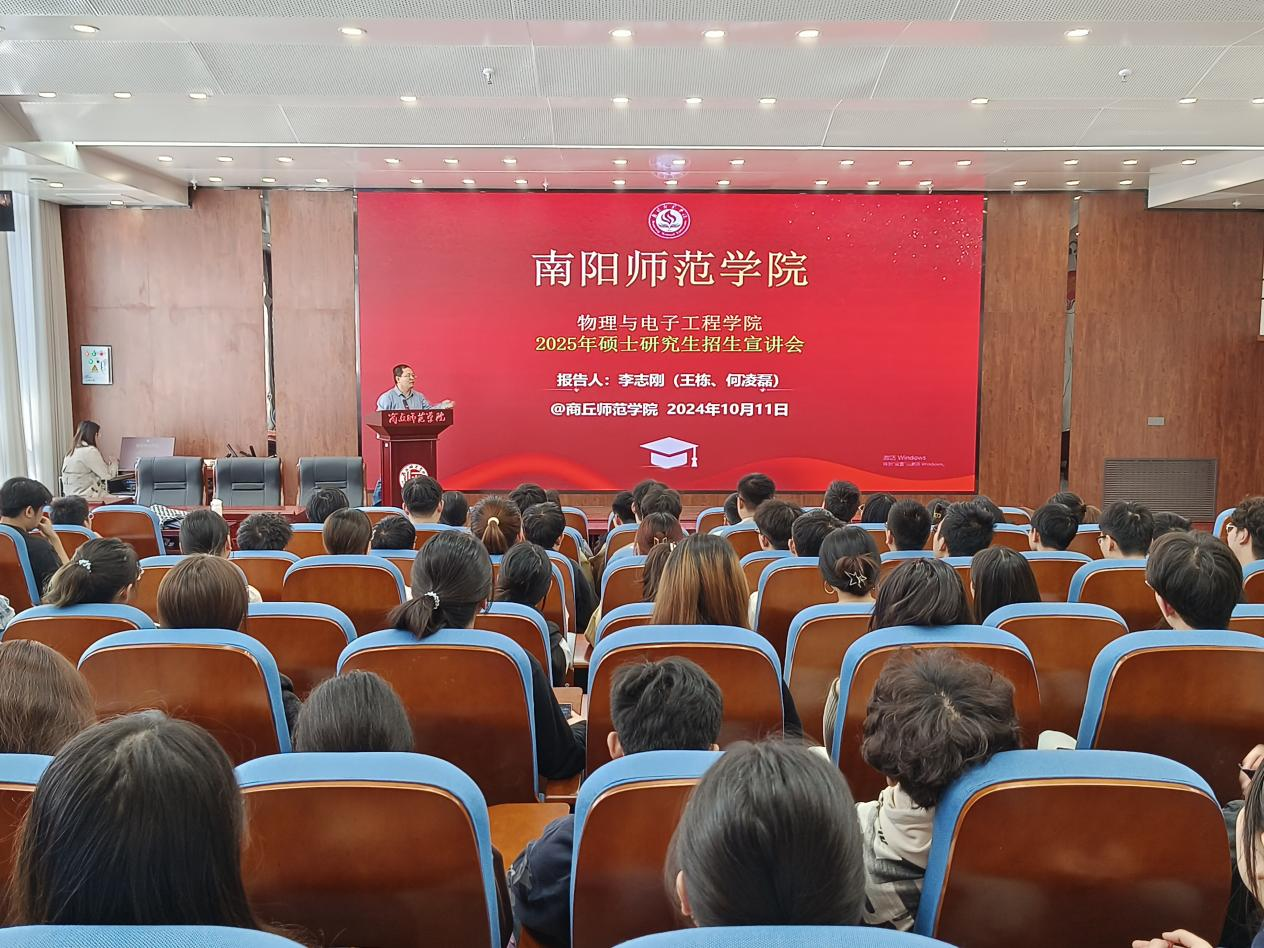 10月11日,南阳师范学院物理与电子工程学院硕士生导师李志刚一行三人来我院进行研究生招生宣讲,物理学和电子信息工程专业学生参加。宣讲会由院党委副书记蒋玉涛主持。