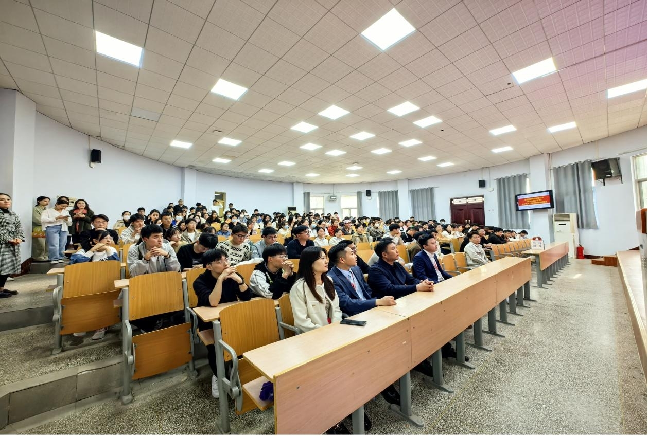 华为终端业务部HRD(人力资源总监)蔡梓萱,华为终端商丘办事处主管彭正伟,华为终端商丘办事处零售经理刘书丞,我院党委副书记蒋玉涛、全体辅导员老师出席,我院350余名2023届毕业生参会。