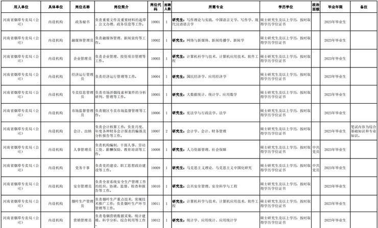 河南省烟草专卖局(公司)下辖18个市级局(公司)、133个县级局(分公司),主要承担辖区烟草专卖市场管理、烟叶生产经营、卷烟营销职能。根据工作需要,现面向社会公开招聘英才。