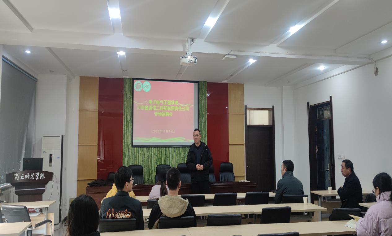 11月16日,河南省通信工程局有限责任公司综合部经理贺广进与项目经理李威一行两人到我院举办专场招聘,我院党委副书记蒋玉涛、2024届毕业班辅导员李小亚和王兴及2024届毕业生代表参加招聘会。