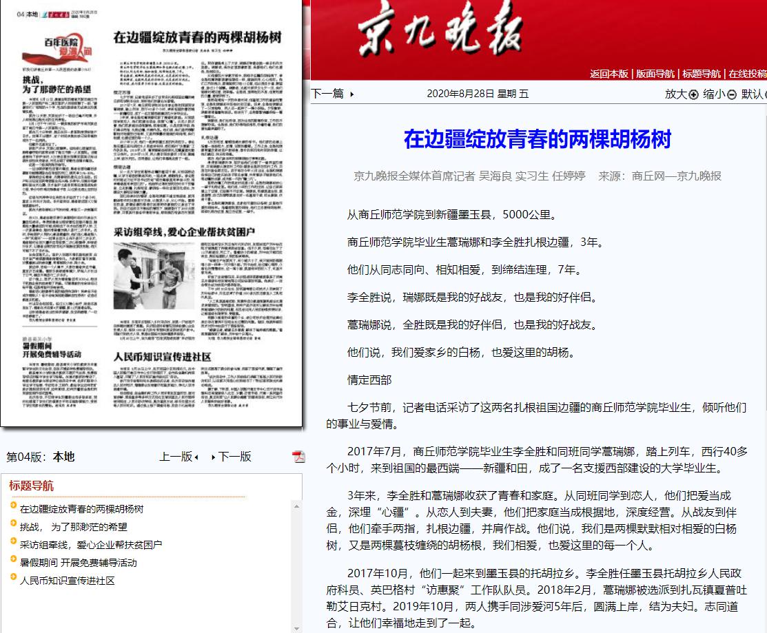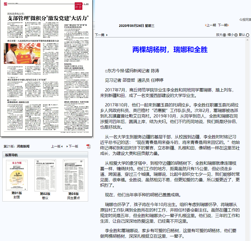 3、《京九晚报》:在边疆绽放青春的两棵胡杨树