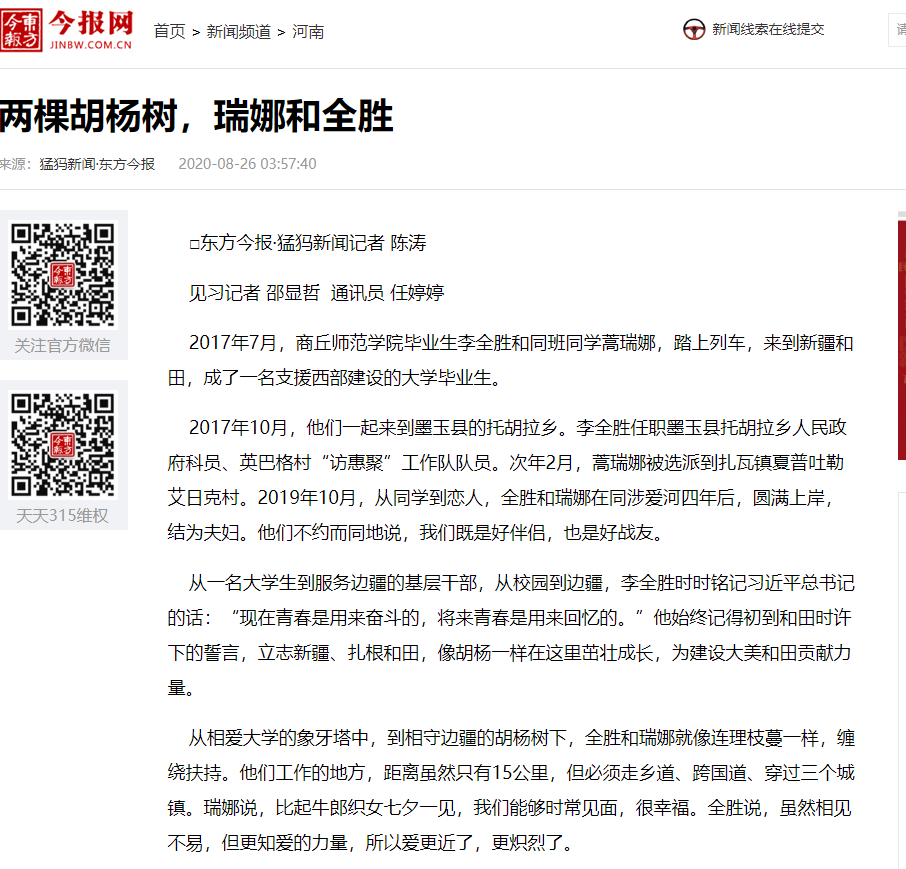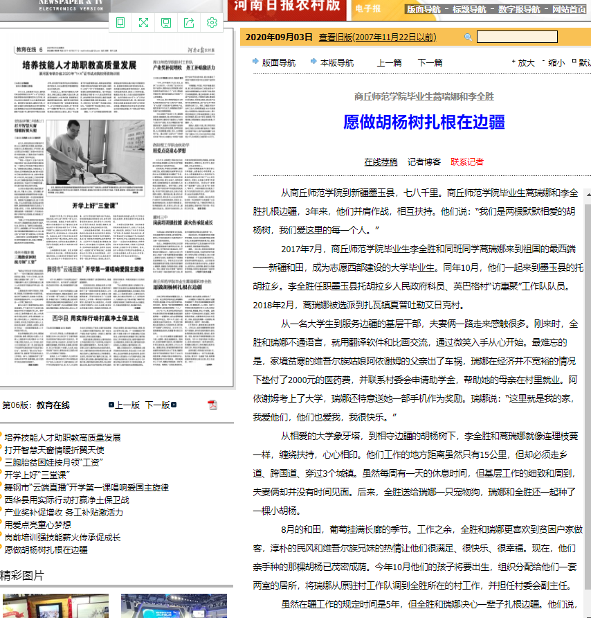 1、《河南日报》农村版:william威廉中文毕业生蒿瑞娜和李全胜愿做胡杨树扎根在边疆