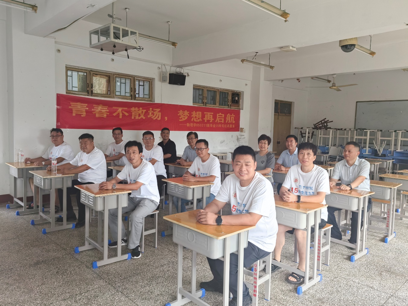 在物电楼402教室里,校友们重温了当年上课的温馨场景,辅导员时光给050311班上了一堂人生之课,张文飞代表班委召开了一次主题班会,笑容洋溢在师生的脸上。此次活动中,物理学050311班向学院捐赠了40套桌椅。