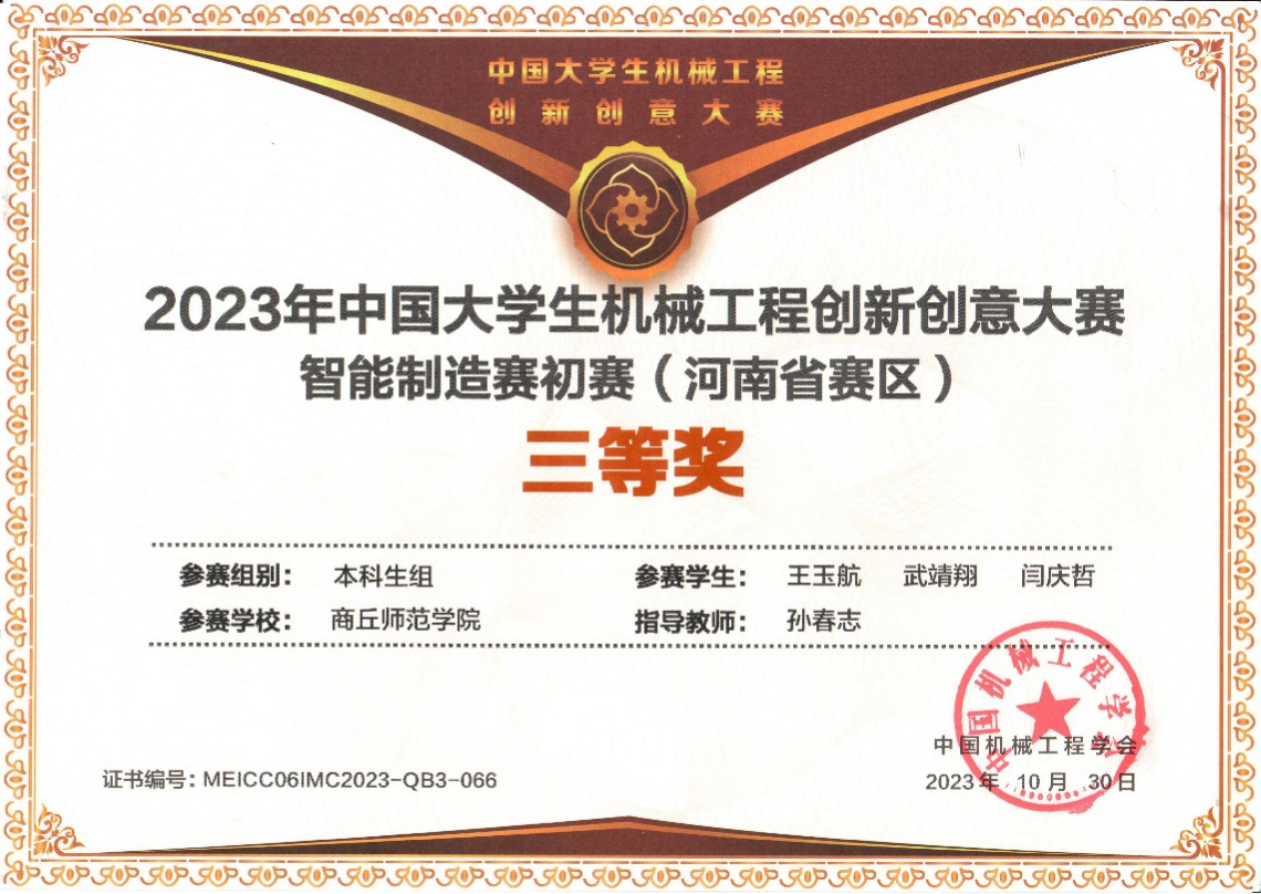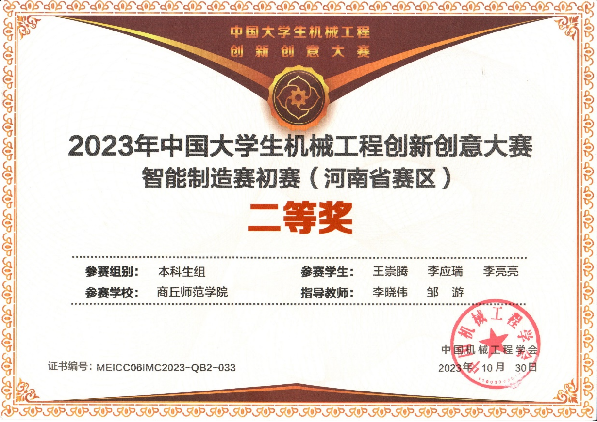近日,2023年中国大学生机械工程创新创意大赛智能制造赛河南省赛比赛结果公布。威廉williamhill团队(指导教师:李晓伟,邹游,参赛学生:王崇腾、李应瑞、李亮亮;指导教师:孙春志,参赛学生:王玉航、武靖翔、闫庆哲;)在2023年中国大学生机械工程创新创意大赛智能制造赛河南省赛中分别荣获省级二等奖、省级三等奖。