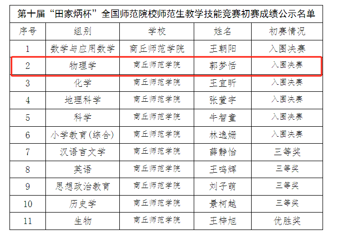 近日,全国师范院校师范生教学技能竞赛组委会公布了“田家炳杯”第十届全国师范院校师范生教学技能大赛初赛结果。我院物理学(全免)22-1班郭梦恬同学入围决赛。本次大赛我校推荐的11名选手在全国1831名参赛选手中脱颖而出全部获奖。最终,共6名选手入围全国决赛。