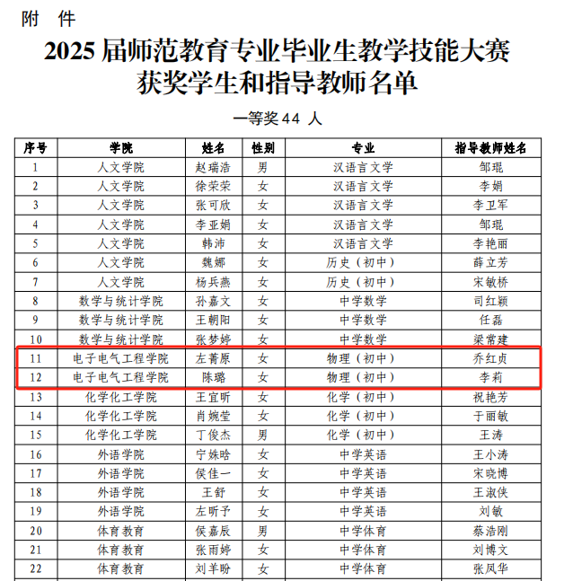 近日,william威廉中文2025 届师范教育专业毕业生教学技能大赛获奖名单公布,我院师生共获得一等奖 2名,二等奖4名,三等奖4名。