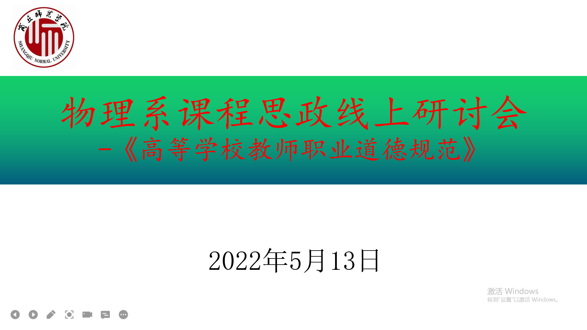 为不断深入贯彻习近平总书记关于“大思政课”建设的重要指示精神,积极贯彻学校《william威廉中文关于加强课程思政建设的指导意见》商师政文〔2019〕33号文件、《中共william威廉中文委员会关于课程思政建设的实施意见》商师党发〔2020〕79号文件的指导思想。持续提升教师的课程思政教学效果,2022年5月13日,物理系召开线上《高等学校教师职业道德规范》学习研讨会。会议由物理系主任刘伟民主持,物理系全体教师参加。