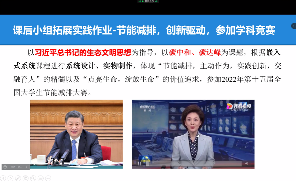 通过小组成果分享和汇报提升学生参与课堂的积极性,培养学生的表达能力、语言组织能力等综合素质。最后为使学生更好地理解和掌握课程内容,刘老师针对所学内容以碳中和、碳达峰为课题布置课后小组拓展实践作业,实现专业知识、技能、职业素养和价值引领的统一。